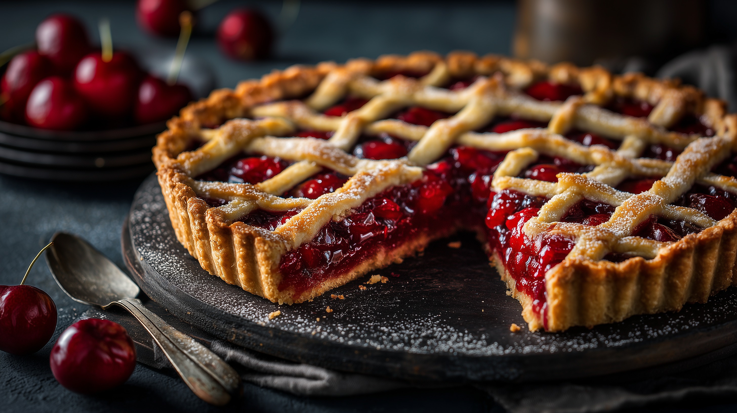 Auf dem Foto sehen wir einen prächtigen, selbstgemachten Kirschkuchen mit einer wunderbaren Gitterstruktur aus goldgelben Teigstreifen. Die tiefroten Kirschen schimmern verlockend durch die Gitterform hindurch und verströmen einen köstlichen, fruchtigen Duft. Der Kuchen wurde auf einem schlichten, dunklen Teller angerichtet, was den Kontrast zu den leuchtenden Farben und der appetitlichen Textur des Gebäcks perfekt in Szene setzt.