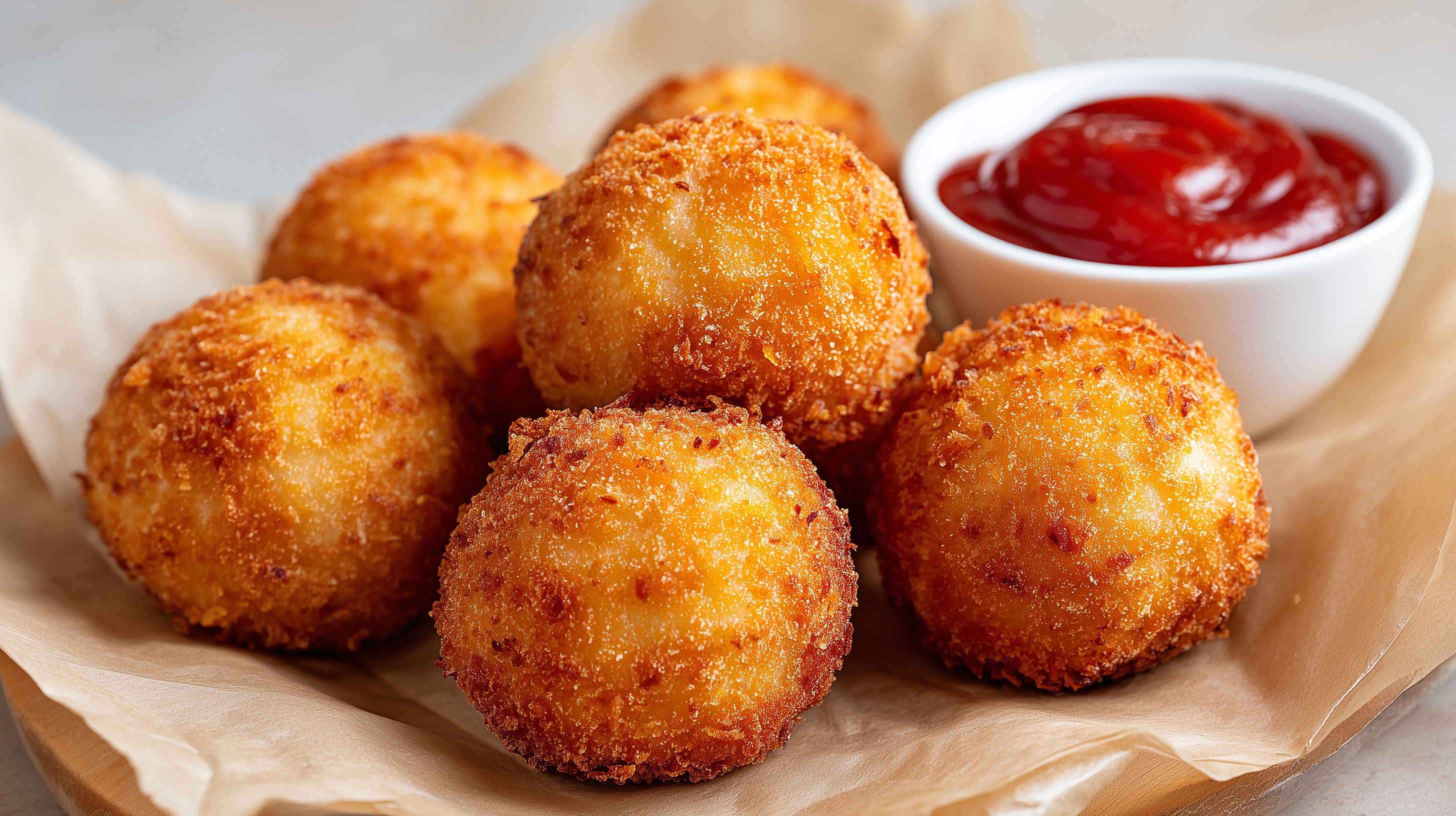 Das Foto zeigt eine Portion köstlicher Käseknödel, die goldbraun in einem weißen Papierkörbchen serviert werden. Die knusprig gebackenen Knödel haben eine leicht raue Oberfläche und sind mit einer pikanten roten Tomatensauce angerichtet, die in einem kleinen weißen Schälchen neben den Knödeln steht. Die warmen Farbtöne von Orange und Rot verleihen dem Gericht eine appetitliche Ausstrahlung. Dieses Foto eignet sich hervorragend für die Verwendung in Rezeptbeiträgen, Social-Media-Posts oder Präsentationen zu herzhaften Snacks und Fingerfood. Es transportiert ein Gefühl von Gemütlichkeit und Genuss und lädt dazu ein, diese leckeren Käseknödel selbst auszuprobieren.