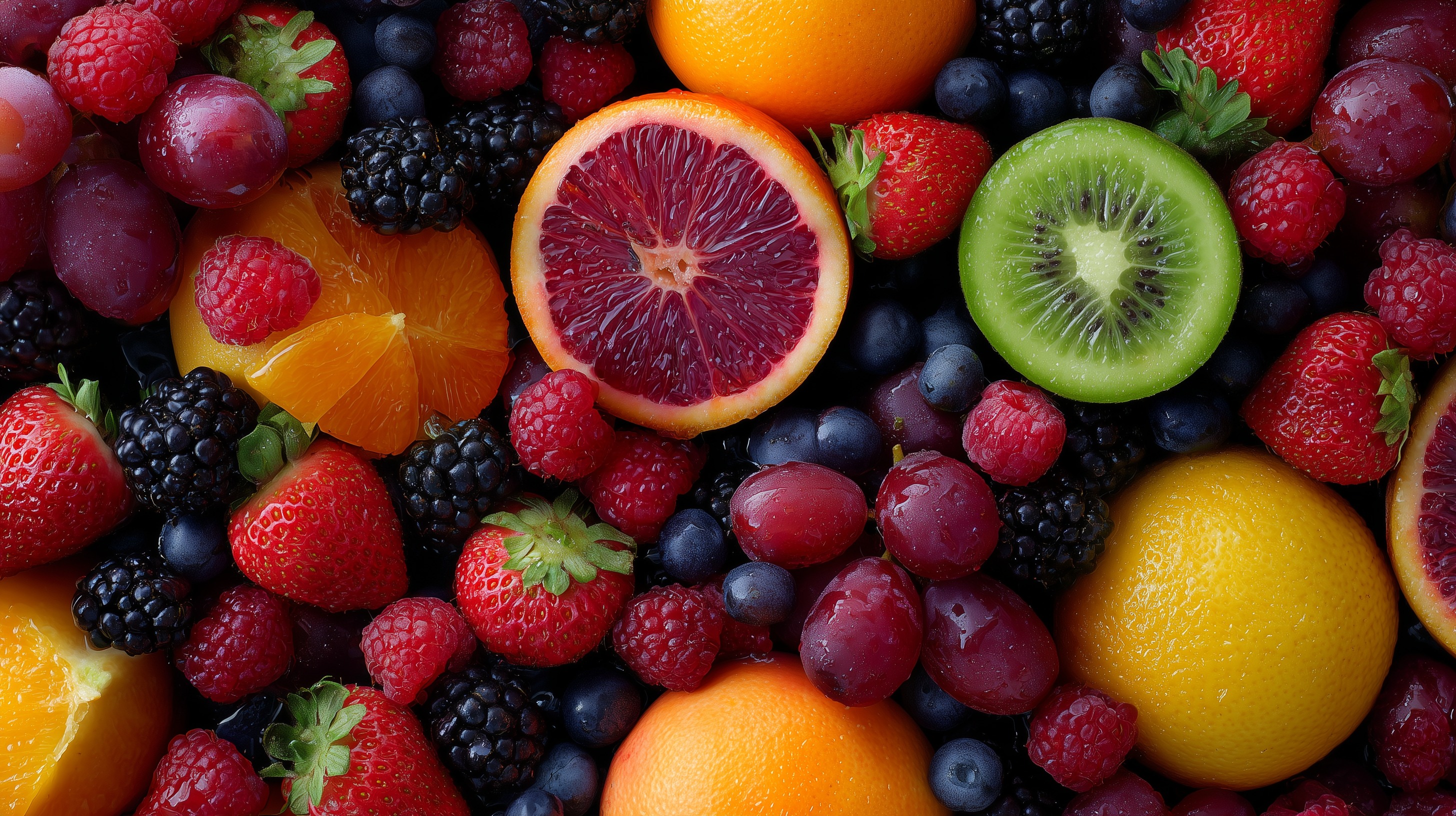 Dieses Foto zeigt eine farbenprächtige Auswahl an sommerlichen Früchten und Beeren. Im Mittelpunkt stehen eine blutorangen-farbige Zitrusfrucht sowie eine grüne Kiwi, umgeben von knallroten Erdbeeren, violetten Weintrauben, dunkelblauen Heidelbeeren und schwarzen Brombeeren. Die Früchte sind frisch und saftig und verleihen dem Arrangement einen intensiven Farbkontrast. Die Aufnahme besticht durch ihre detailreiche, nahsichtige Perspektive, welche die unterschiedlichen Texturen und Strukturen der Früchte hervorhebt. Dieses Bild eignet sich perfekt als Hintergrund für Lebensmittel-Blogs, Social-Media-Beiträge, Werbematerialien oder als stimmungsvolle Illustration in Kochbüchern und Menüs. Es vermittelt einen gesunden, natürlichen und appetitlichen Eindruck.