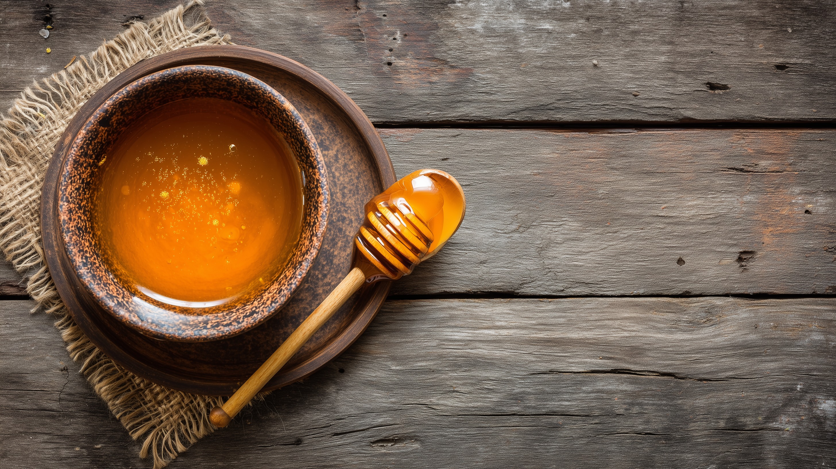 Auf diesem Foto sehen wir eine Honigschöpfkelle, die auf einem rustikalen Holztisch platziert ist. Der Honig in der Kelle leuchtet in einem satten, goldenen Farbton und lässt die Oberflächenstruktur des Materials deutlich erkennen. Der Tisch selbst weist eine natürliche, verwitterte Optik auf, die dem Bild eine ländliche, gemütliche Atmosphäre verleiht.