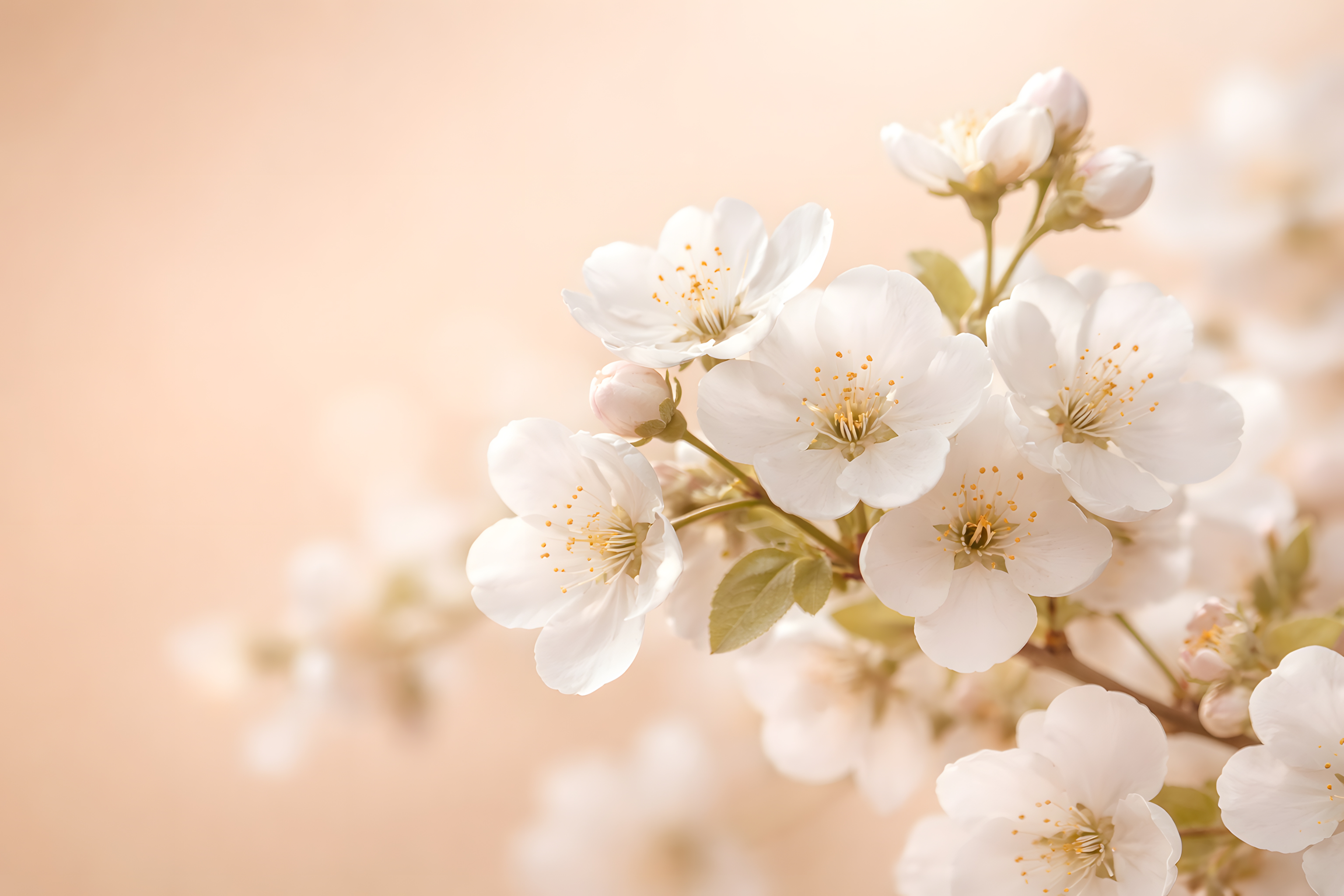 Dieses bezaubernde Foto zeigt eine zarte Ansammlung von Kirschblüten, die im warmen Licht eines Frühlingstages erstrahlen. Die pastelligen Farben, die sanft verschwommenen Konturen und der weiche Fokus verleihen der Szene eine geradezu märchenhafte Anmutung. Die filigranen, blütenförmigen Strukturen scheinen fast schwebend vor dem hellen, leicht rosafarbenen Hintergrund zu schweben, was dem Motiv eine leichte, schwebende Anmutung verleiht.