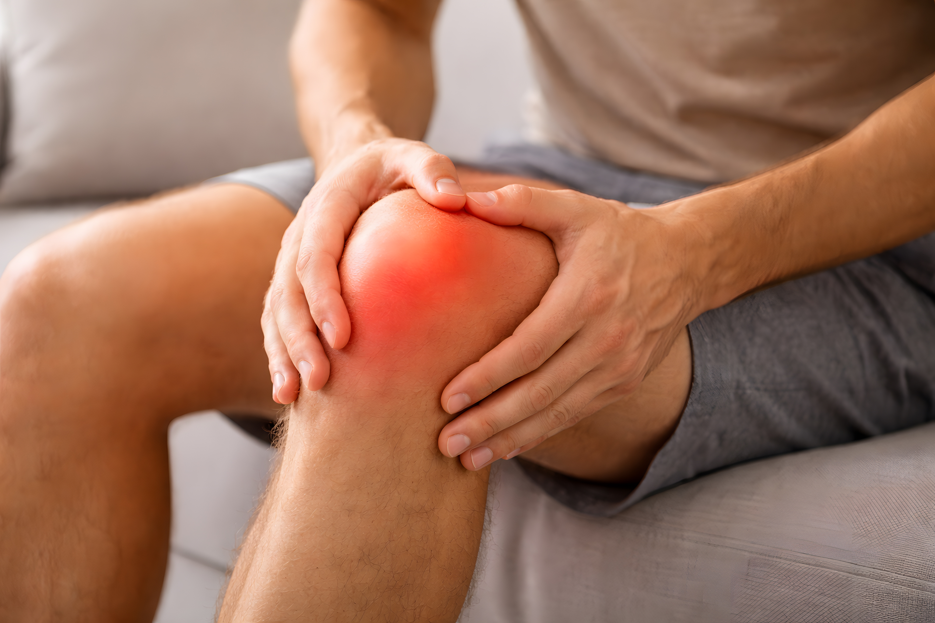 Das Foto zeigt eine schmerzhafte Kniegelenksentzündung. Die Hände massieren und stützen das Knie, das deutlich gerötet erscheint. Dies deutet auf eine Schwellung und Entzündung des Gelenks hin. Solche Knieschmerzen können durch Verletzungen, Überbeanspruchung oder Arthrose verursacht werden und erfordern eine genaue ärztliche Untersuchung und angemessene Behandlung, etwa durch Physiotherapie, Medikamente oder spezielle Therapien.