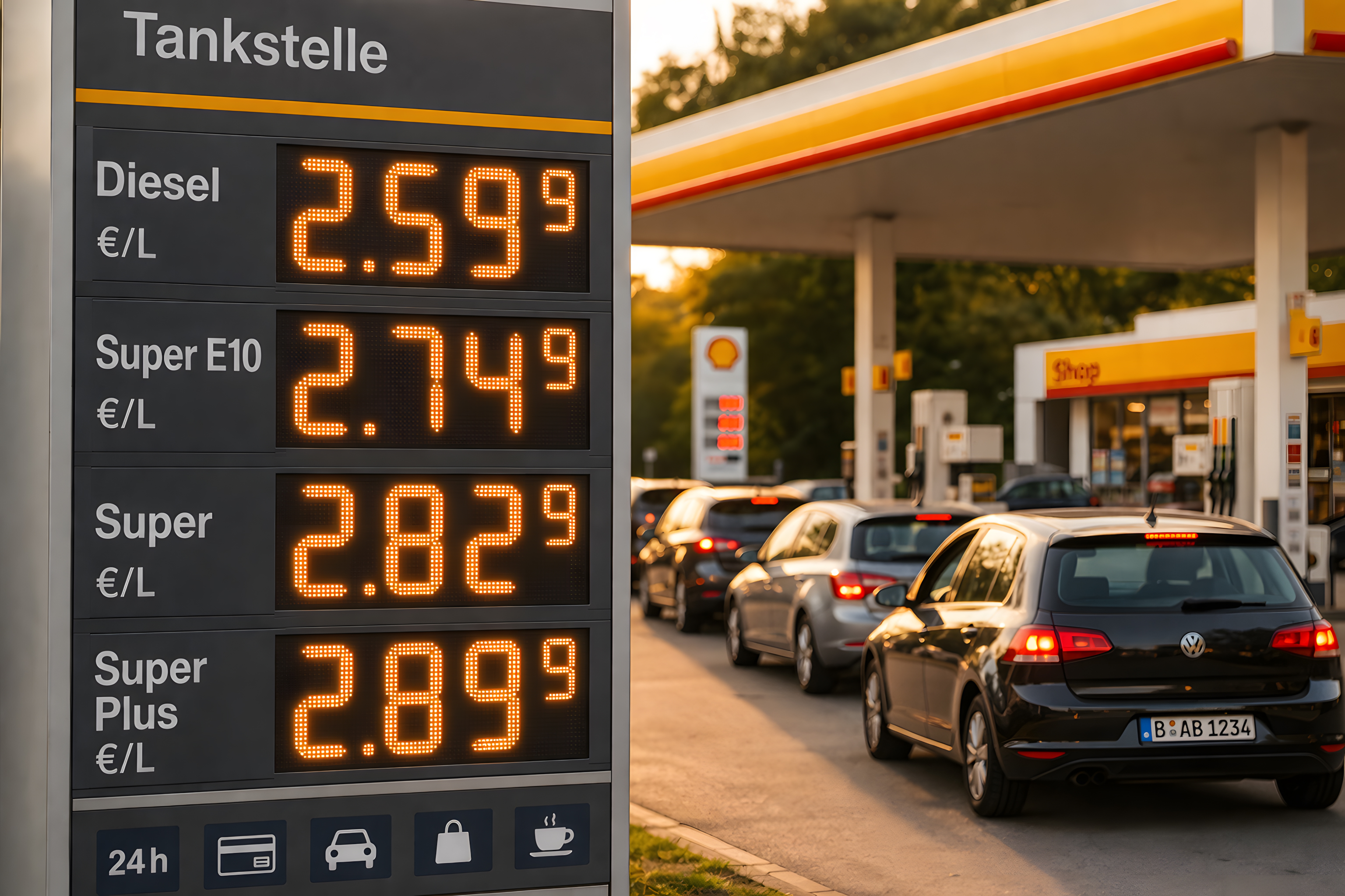 Das Foto zeigt eine Tankstelle an einem Sommerabend. Die großen digitalen Preisanzeigen zeigen die aktuellen Preise für Diesel, Super E10 und Super Plus in Euro pro Liter. Im Hintergrund sind Autos zu sehen, die an der Tankstelle halten, um zu tanken. Die Beleuchtung der Tankstelle und das Abendlicht erzeugen eine warme, gelbe Atmosphäre. Das Bild vermittelt Transparenz bei den Kraftstoffpreisen und den täglichen Mobilitätsanforderungen von Autofahrern. Es kann in Blogbeiträgen, sozialen Medien oder Präsentationen rund um Themen wie Energie, Konsum und Einzelhandel eingesetzt werden.