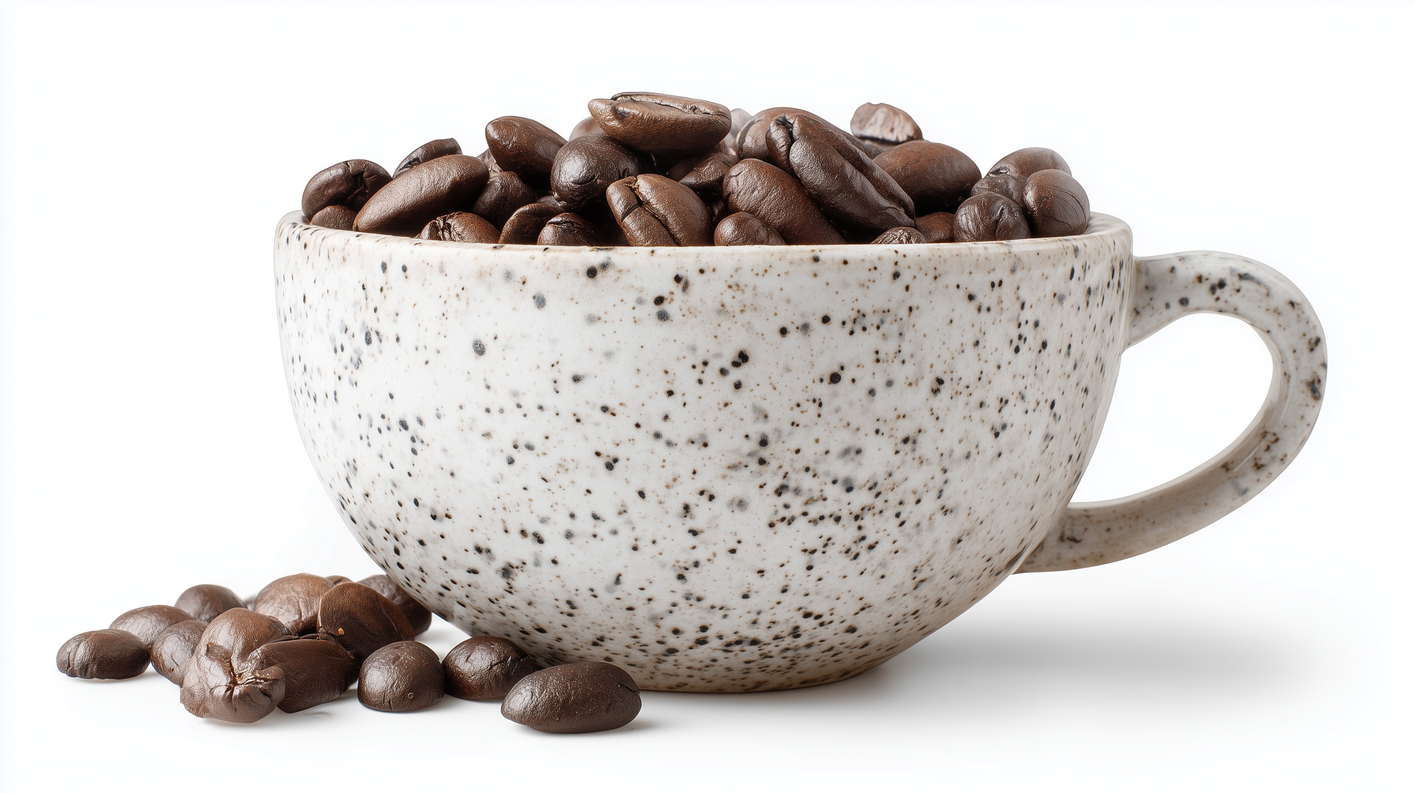 Das Foto zeigt eine gefüllte Kaffeetasse mit rustikaler, gesprenkelter Optik. Darauf sind zahlreiche, dunkel geröstete Kaffeebohnen zu sehen, die auf ihren Genuss warten. Die Tasse hebt sich durch ihre einzigartige Beschaffenheit und neutrale Farbgebung vom Hintergrund ab und lenkt den Blick des Betrachters gezielt auf den Kaffee als Mittelpunkt des Bildes. Diese Aufnahme eignet sich hervorragend für den Einsatz in Blogbeiträgen, Social-Media-Posts oder Newslettern rund um das Thema Kaffee und Kaffeekultur. Sie vermittelt ein Gefühl von Natürlichkeit und Entspannung und kann Betrachter zum Kaffeegenuss inspirieren.
