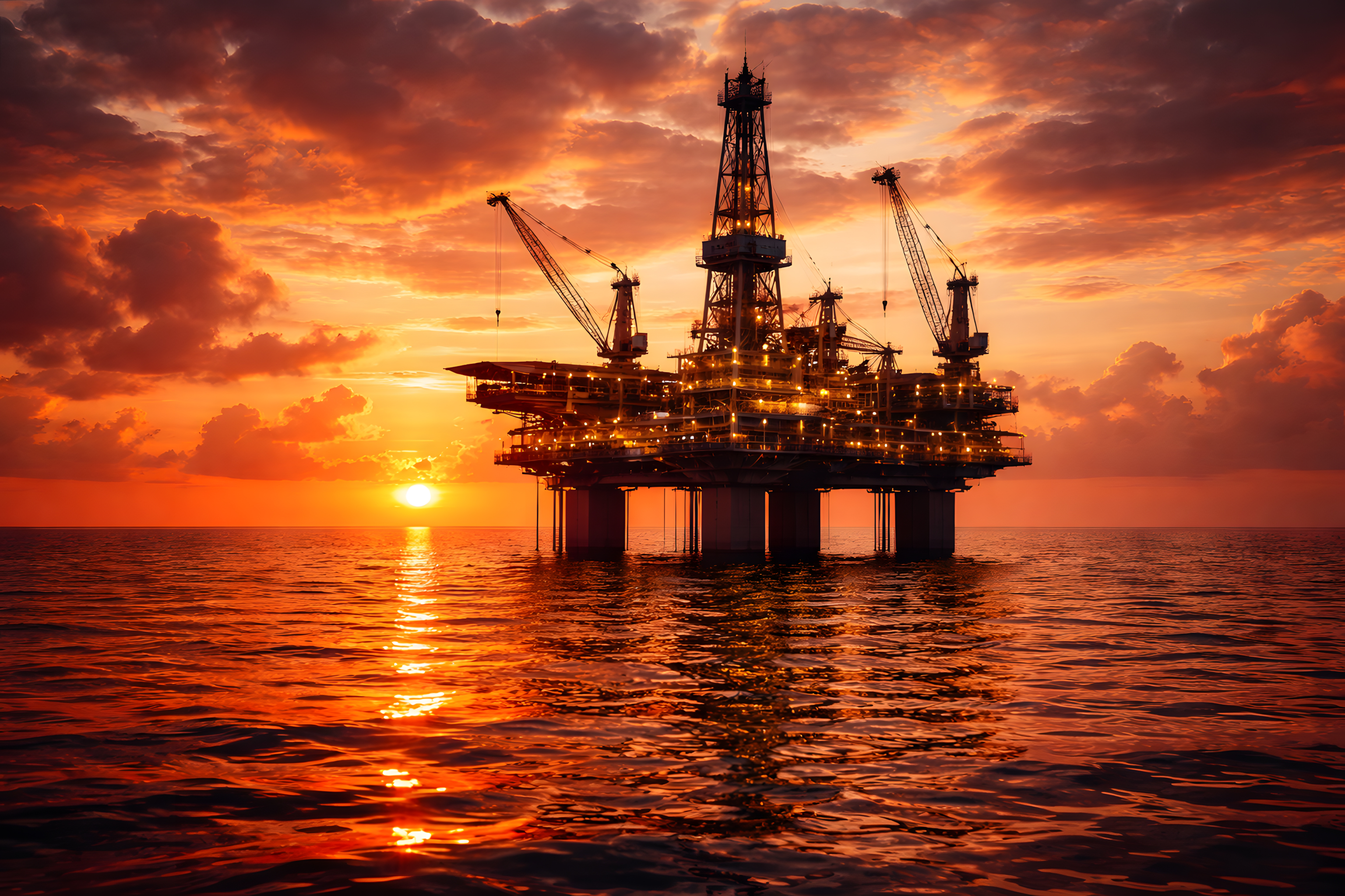 Das Foto zeigt eine imposante Ölplattform, die sich im Meer unter einem dramatischen Sonnenuntergang abhebt. Die orangeroten Wolken am Horizont spiegeln sich im ruhigen Wasser wider, was der Szene eine malerische Atmosphäre verleiht. Die Plattform mit ihren Kränen, Plattformen und Beleuchtung sticht eindrucksvoll aus der Umgebung hervor und verleiht dem Bild einen technischen, industriellen Charakter. Dieses Foto eignet sich hervorragend für den Einsatz in Blogs, Social-Media-Kanälen, Präsentationen oder Newslettern, um Themen wie Energie, Offshore-Industrie oder Technik visuell ansprechend darzustellen.