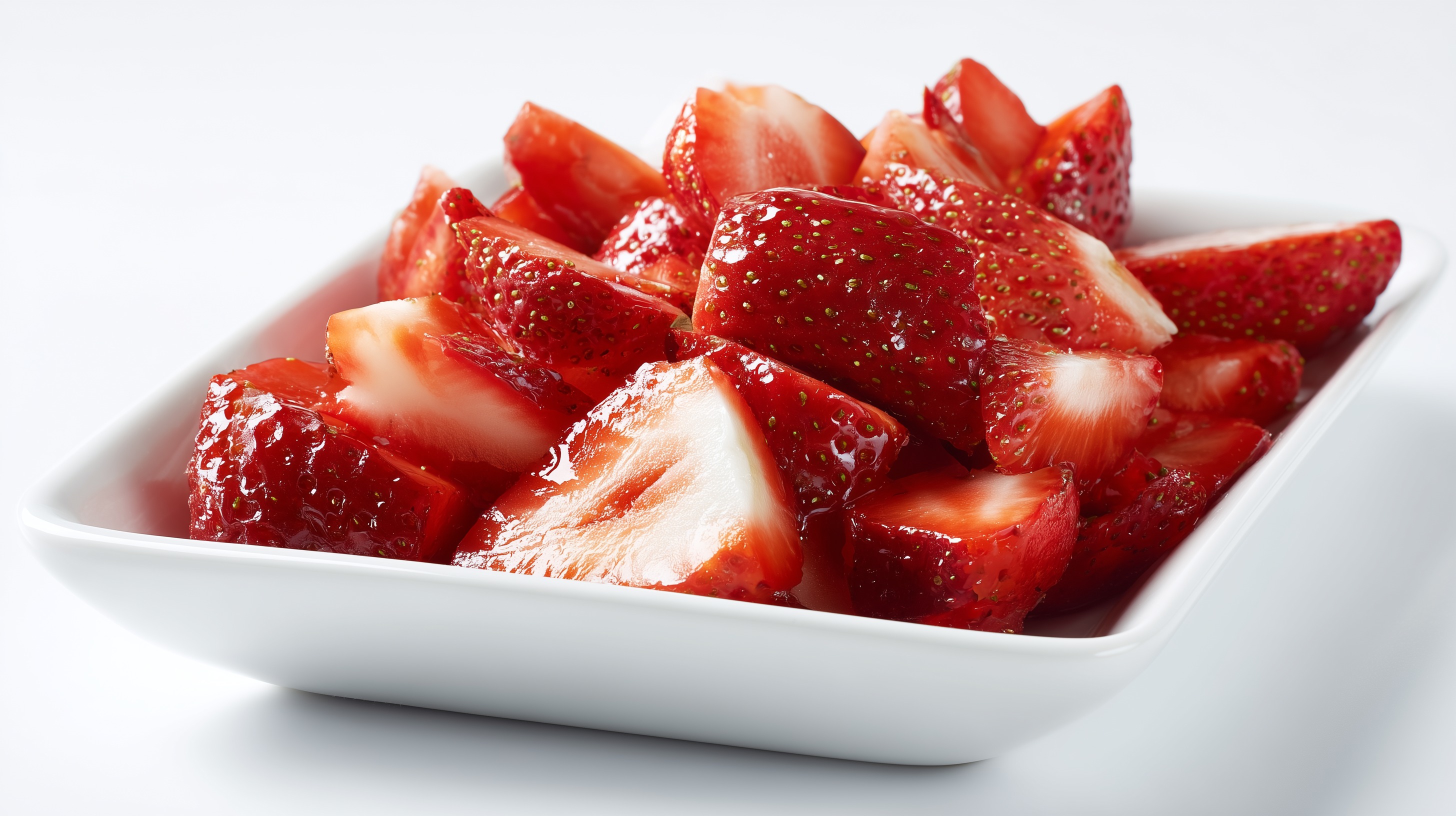 Das Foto zeigt eine Schale mit frischen, roten Erdbeerstücken auf einem weißen Teller. Die saftigen Früchte wurden in mundgerechte Scheiben geschnitten und verbreiten eine appetitliche, natürliche Optik. Die Aufnahme besticht durch ihre klaren Formen, kräftigen Farben und den minimalistischen Hintergrund, der den Fokus ganz auf die Erdbeeren lenkt. Dieses Bild eignet sich hervorragend für die Verwendung in Rezepten, Produktpräsentationen oder zur Steigerung der Appetitlichkeit in Beiträgen rund um gesunde Ernährung und Lebensmittel. Mit seiner frischen und einladenden Ausstrahlung versprüht es pure Vitalität.