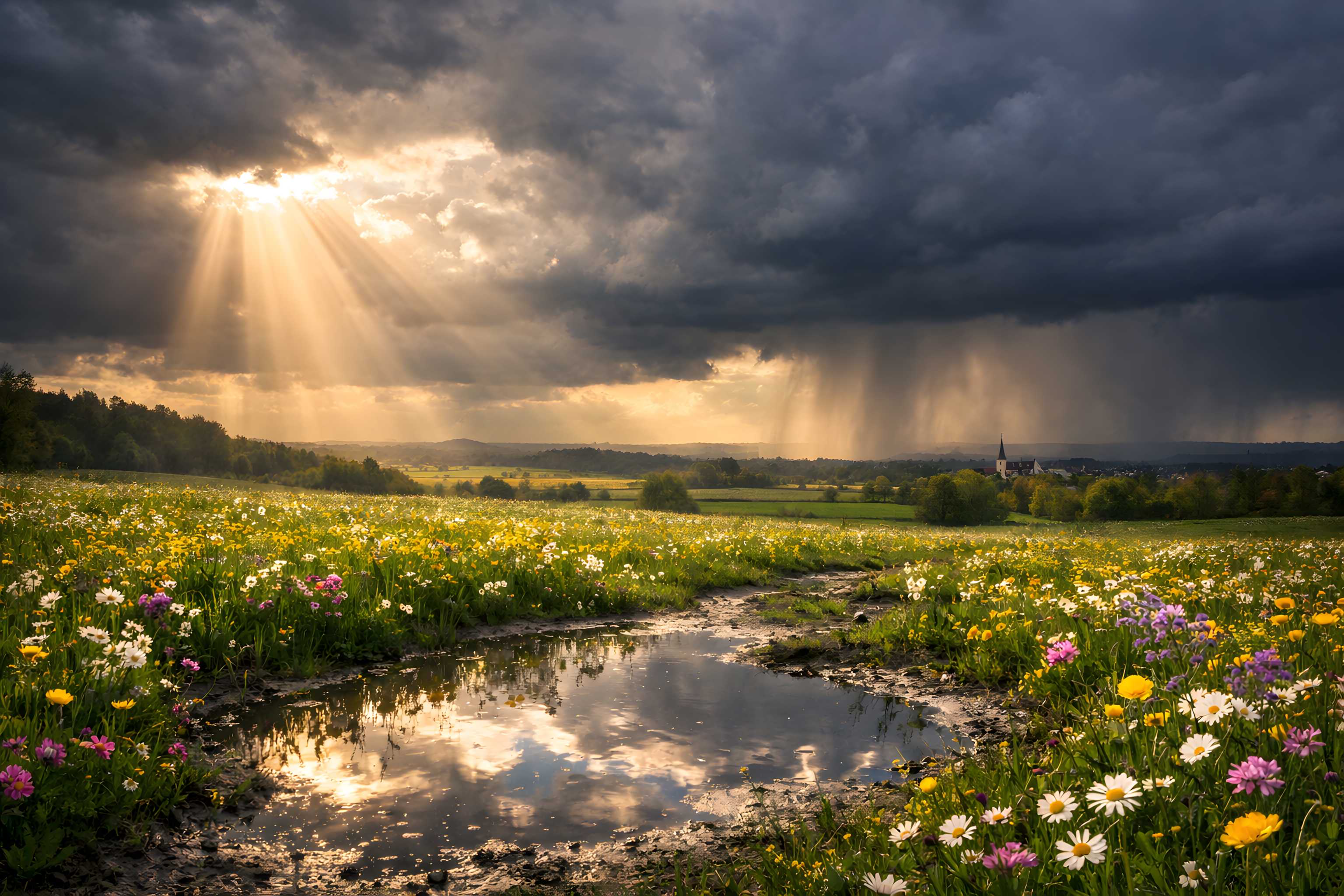 Dieses stimmungsvolle Foto zeigt eine malerische Landschaft bei Sonnenuntergang. Der Blick schweift über eine idyllische Wiesenlandschaft, die von einer Reihe blühender Blumen gesäumt ist. Ein kleiner Fluss schlängelt sich durch die Szenerie und spiegelt die dramatischen Wolkenformationen und den warmen Lichteinfall wider. In der Ferne sind die Umrisse eines Dorfes zu erkennen, was der Landschaft eine friedliche, ländliche Note verleiht.