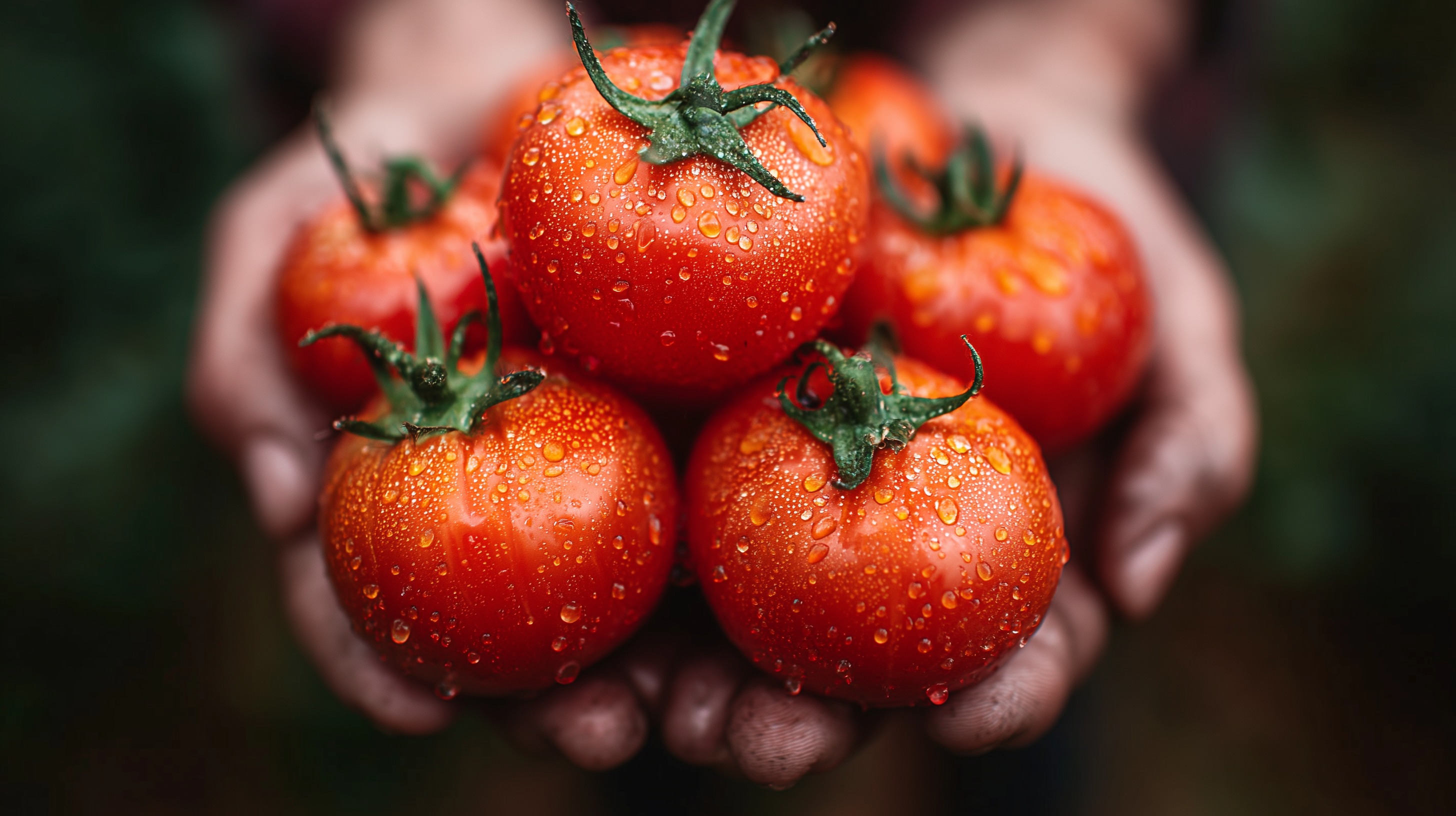 Dieses Foto zeigt eine Nahaufnahme von saftigen, roten Tomaten mit Wassertropfen auf ihren glänzenden Oberflächen. Die Tomaten werden von Händen liebevoll gehalten, was einen natürlichen und organischen Eindruck vermittelt. Die kräftige Rot-Grün-Farbpalette sorgt für einen appetitanregenden Kontrast und verleiht dem Bild eine frische, vitale Ausstrahlung.