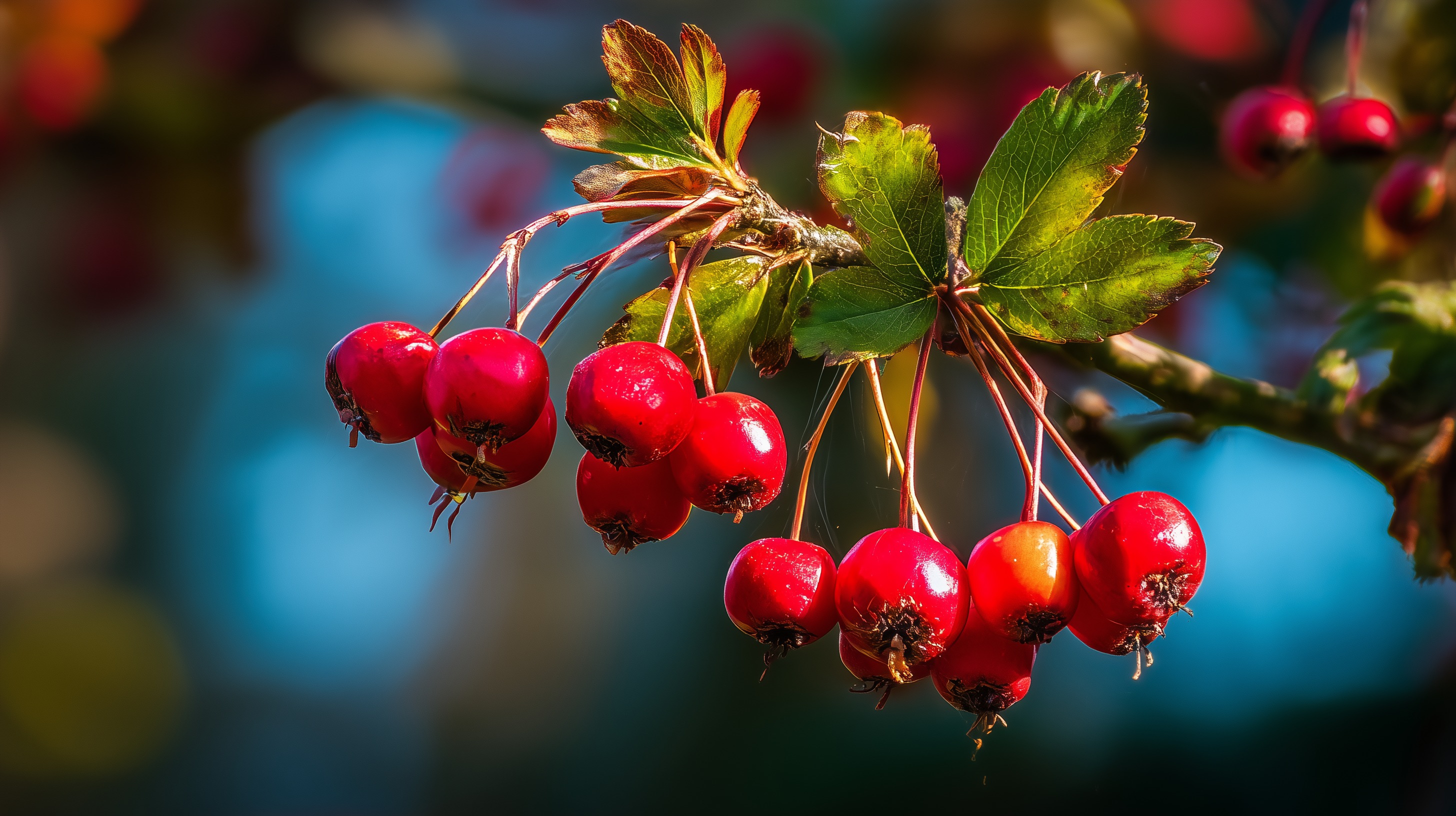 Das Foto zeigt eine faszinierende Nahaufnahme von prächtigen roten Beeren, die an üppigen, grünen Zweigen wachsen. Die Beeren leuchten in einem intensiven Rot und kontrastieren wundervoll mit den knallgrünen Blättern. Die scharfe Fokussierung und der unscharfe Hintergrund lenken den Blick gezielt auf das Hauptmotiv, die wunderschönen Früchte. Dieses Bild wäre perfekt für Herbst-Blogbeiträge, Social-Media-Posts oder Präsentationen zum Thema Natur, Botanik oder Ernährung. Die hohe Auflösung und der stimmungsvolle, natürliche Look machen es zu einem attraktiven Eye-Catcher, der Besucher oder Kunden begeistern kann.