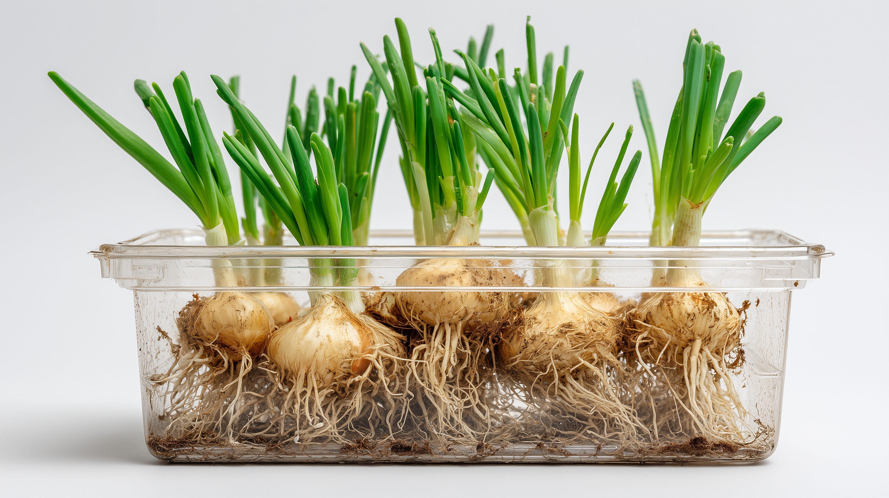 Die Komposition wirkt natürlich und minimalistisch, wobei der weiße Hintergrund den Fokus ganz auf die Zwiebelpflanzen lenkt. Dieses Foto eignet sich hervorragend für den Einsatz in Blogs, Social-Media-Beiträgen oder Präsentationen zu Themen wie Ernährung, Nachhaltigkeit, Kochen und gesunde Lebensweise. Es vermittelt Frische, Vitalität und den Reiz des Wachsens aus der Natur.