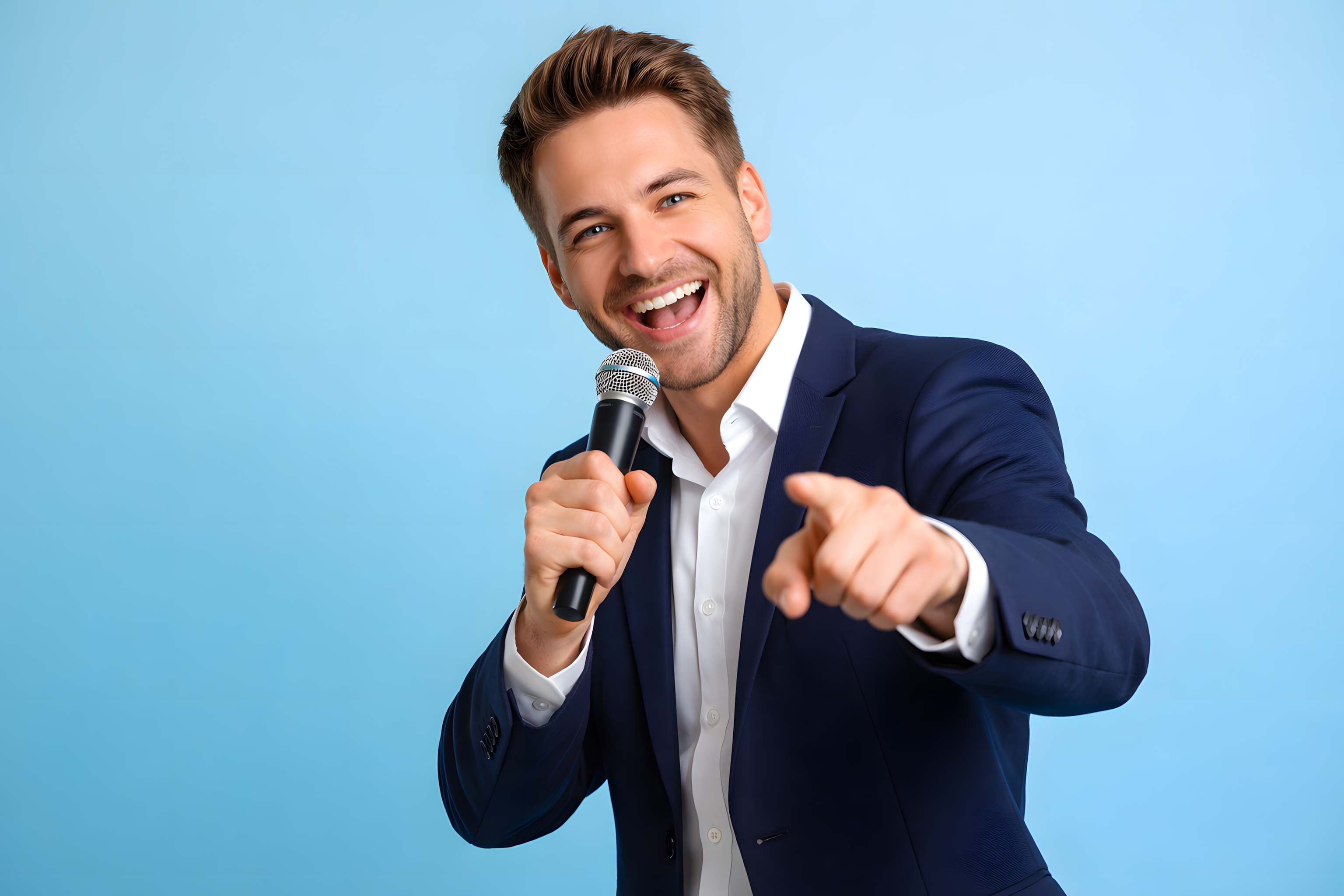 Das Foto zeigt einen lachenden Geschäftsmann in einem dunkelblauen Anzug, der ein Mikrofon in der Hand hält und mit einer ausdrucksstarken Geste auf den Betrachter zeigt. Der Mann strahlt Energie, Selbstvertrauen und Optimismus aus. Die Nahaufnahme des Gesichts und der dynamische Moment lassen den Eindruck eines professionellen Redners oder Präsentators entstehen. Dieses Bild könnte ideal für Blogbeiträge, Social-Media-Posts, Werbematerialien oder Präsentationen zu Themen wie Führung, Vertrieb, Marketing oder Motivation eingesetzt werden.