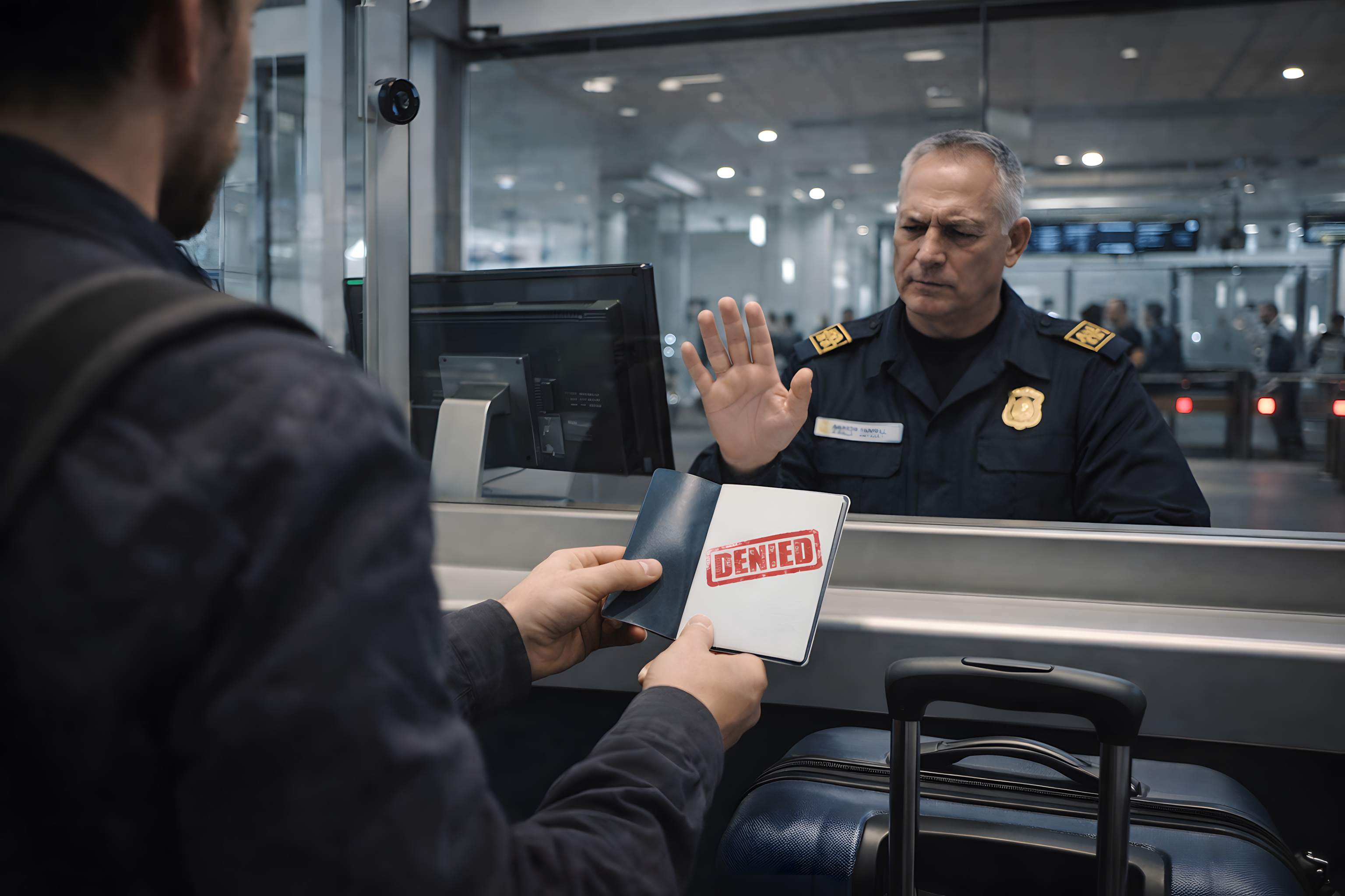 Das Foto zeigt einen Sicherheitsbeamten in Uniform, der einem Passagier am Flughafentor den Eintritt verweigert. Der Beamte hebt seine Hand in einer abweisenden Geste, während der Passagier ein Dokument in der Hand hält, das offenbar als Berechtigung dienen sollte. Die Situation vermittelt den Eindruck von Kontrolle und Autorität seitens des Beamten, während der Passagier gezwungen ist, die Entscheidung zu akzeptieren. Das Foto veranschaulicht die strenge Sicherheitsprozedur an Flughäfen und die Macht, die Beamte bei der Überprüfung von Reisenden ausüben. Es kann in Artikeln über Reisen, Sicherheitsmaßnahmen oder die Befugnisse von Behörden eingesetzt werden.