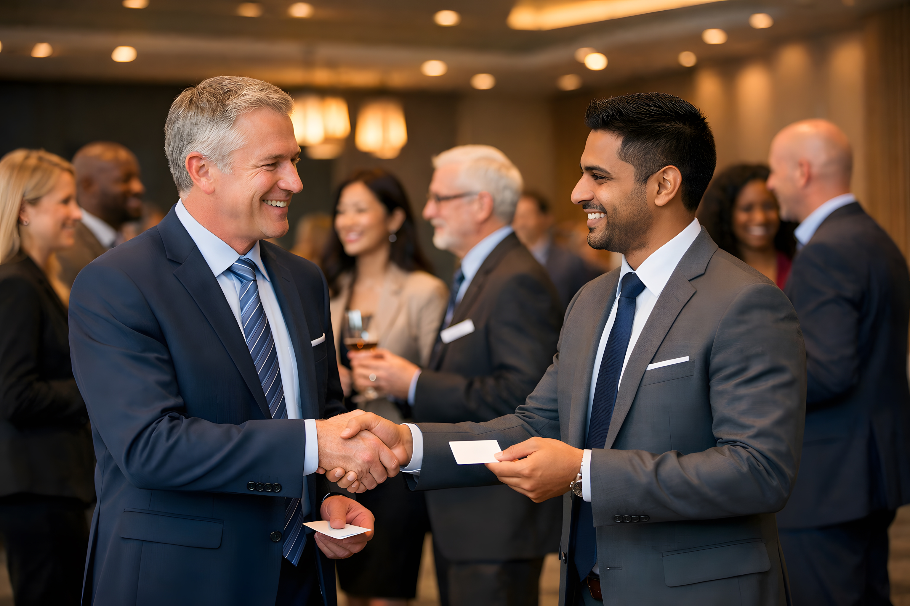 Auf dem Foto sind zwei Männer in Anzügen zu sehen, die sich die Hände schütteln und freundlich lächeln. Sie scheinen Teil einer größeren Gruppe von Geschäftsleuten zu sein, die sich zu einer Networking-Veranstaltung getroffen haben. Das Foto vermittelt den Eindruck von Professionalität, Vertrauen und Kooperation. Die dunklen Anzüge und Krawatten suggerieren einen formellen, aber dennoch ungezwungenen Rahmen. Solche Networking-Events bieten Unternehmern und Führungskräften die Gelegenheit, neue Kontakte zu knüpfen, Geschäftsbeziehungen aufzubauen und sich auszutauschen. Das Bild könnte beispielsweise für Blogbeiträge, Social-Media-Posts oder Präsentationen zu Themen wie Karriere, Unternehmenserfolg oder Geschäftsbeziehungen verwendet werden.
