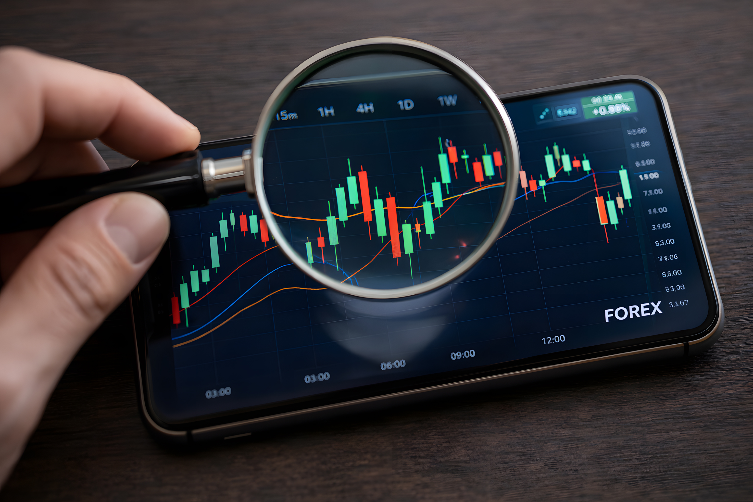 Das Foto zeigt einen Smartphone-Bildschirm, auf dem eine interaktive Finanzmarkt-Analyse zu sehen ist. Der Bildschirm zeigt einen Kerzendiagramm-Verlauf mit verschiedenen Zeitachsen-Optionen wie 1 Stunde, 4 Stunden, 1 Tag und 1 Woche. Mithilfe einer Lupe-Funktion kann man einzelne Bereiche des Diagramms vergrößern, um die Preisentwicklung detaillierter zu betrachten. Die Finanzinformationen werden in einem modernen, übersichtlichen Grafikdesign präsentiert, das die wesentlichen Kennzahlen und Trends hervorhebt. Dieses Foto eignet sich hervorragend für Beiträge zu Themen wie Börse, Investitionen, Wirtschaftsanalyse oder Finanztechnologie. Es kann in Blogs, sozialen Medien oder Präsentationen eingesetzt werden, um Finanzmarkt-Entwicklungen visuell und informativ darzustellen.