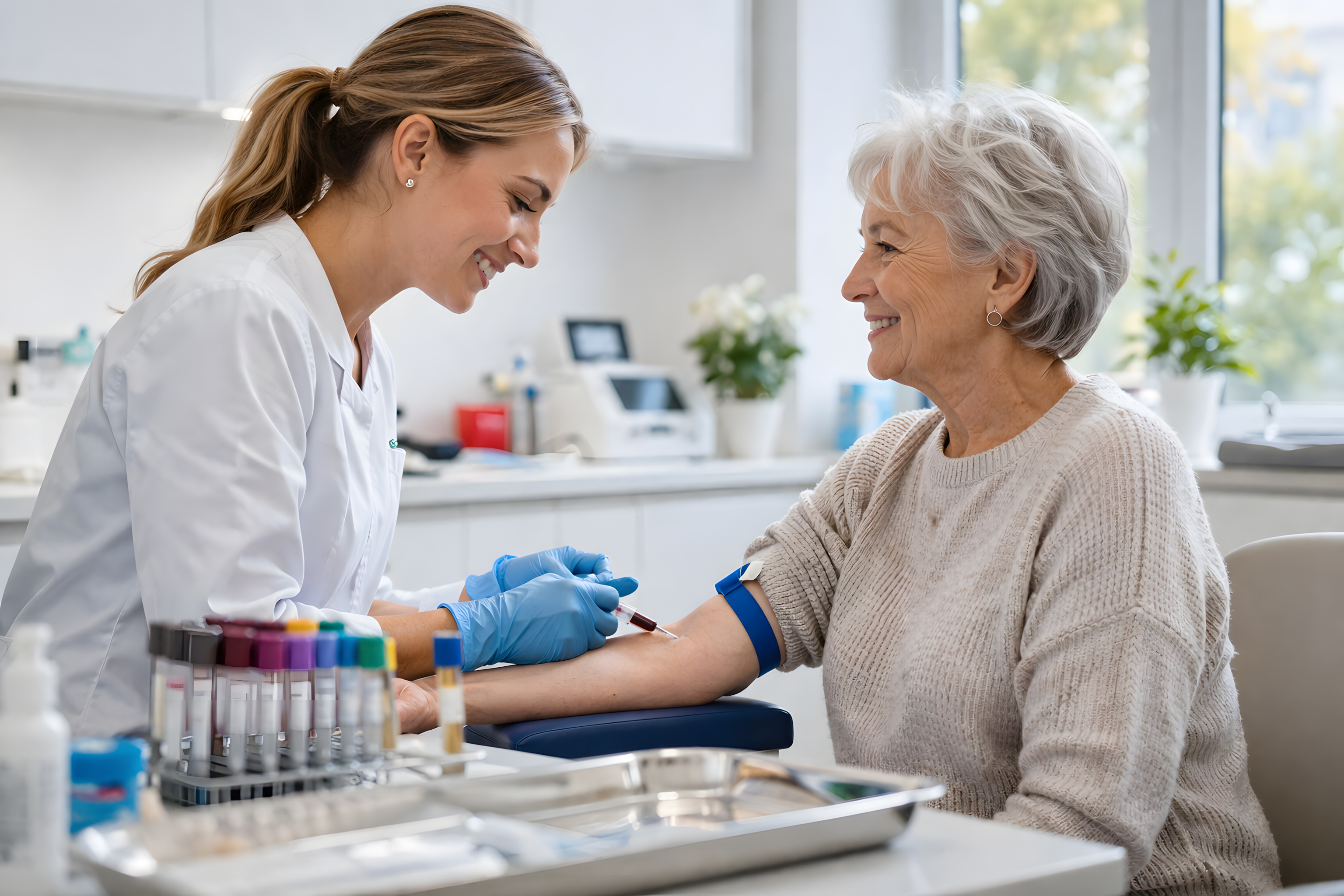 Auf dem Bild sieht man eine Frau in weißer Kleidung, die dem älteren Patienten in einem freundlichen Gespräch den Blutdruck misst. Die Szene vermittelt einen Eindruck von Vertrauen, Kompetenz und Fürsorge in der medizinischen Versorgung. Das Bild könnte zum Beispiel in einem Blog-Beitrag zum Thema Gesundheitsvorsorge, in einem Social-Media-Post zur Wertschätzung des Pflegeberufs oder in einer Präsentation zur Arzt-Patienten-Beziehung eingesetzt werden. Die ruhige Atmosphäre, die hellen Farben und die angenehme Körpersprache der Beteiligten lassen dieses Foto als stimmungsvoll und professionell erscheinen.