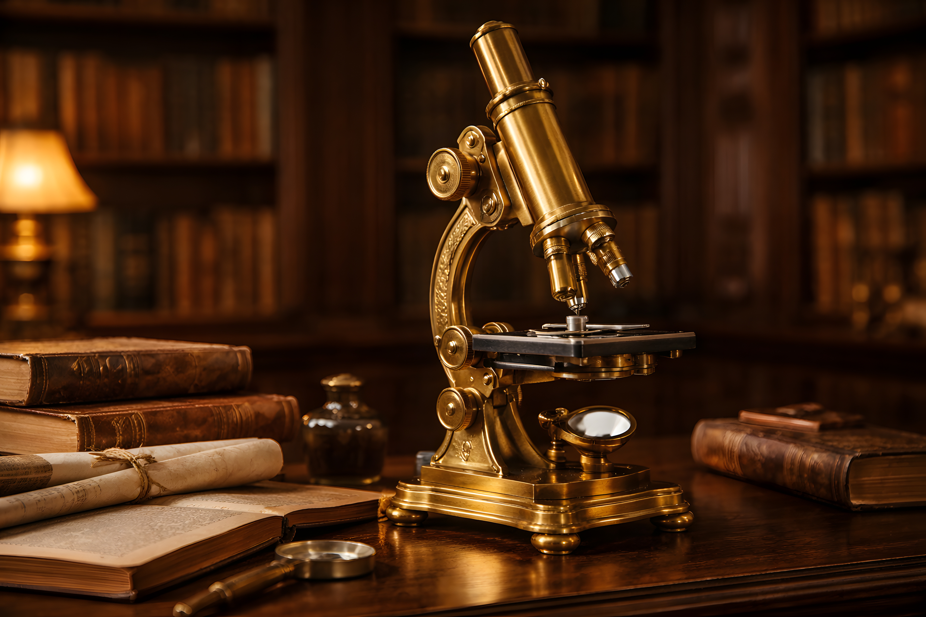 Auf dem Bild ist ein antiker Mikroskop-Rahmen auf einem alten Holztisch zu sehen. Das Instrument aus Messing und Glas ist kunstvoll gestaltet und strahlt eine klassische, historische Atmosphäre aus. Umgeben ist es von Büchern, Pergamentrollen und anderen Utensilien, die eine Forschungssituation in einem alten Studierzimmer oder Labor vermuten lassen. Die warme Beleuchtung, die gedämpften Farben und die detailreiche Verarbeitung des Mikroskops verleihen dem Bild einen authentischen, vintage-artigen Charakter. Dieses Foto könnte für Blogs, Präsentationen oder Social-Media-Beiträge zu Themen wie Geschichte der Wissenschaft, historische Forschung oder auch nostalgie-geladene Produktdarstellungen eingesetzt werden.
