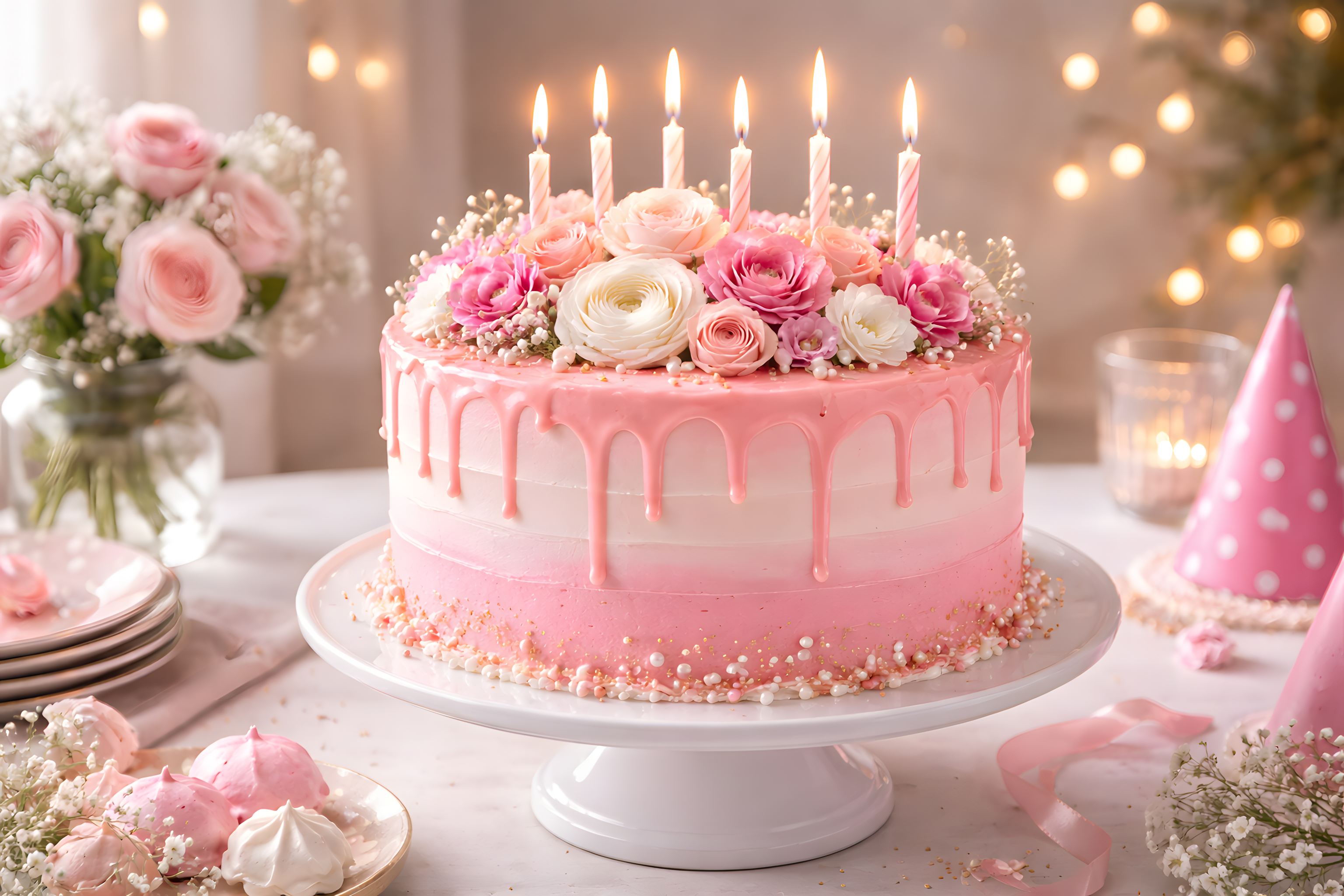 Diese wundervolle Geburtstagsfeier-Torte ist ein echter Blickfang. Die üppige, rosa Buttercreme-Glasur verleiht dem Kuchen ein elegantes Erscheinungsbild. Dekoriert ist die Torte mit einem Kranz aus frischen, zarten Rosen und Ranunkeln, die in zartem Rosa und Weiß gehalten sind. Dazu passen die brennenden Kerzen, die dem Arrangement eine romantische Stimmung verleihen. Die Torte steht auf einem hellen, runden Servietenteller und ist umgeben von einigen weiteren Dekorationselementen wie rosa Geschenkboxen und Luftschlangen. Diese Aufnahme eignet sich hervorragend für Blogs, Social-Media-Posts oder Newsletter rund um Geburtstage, Feiern und Premium-Backwaren. Mit ihrer stilvollen, natürlichen Ausstrahlung vermittelt sie Luxus und Exklusivität.