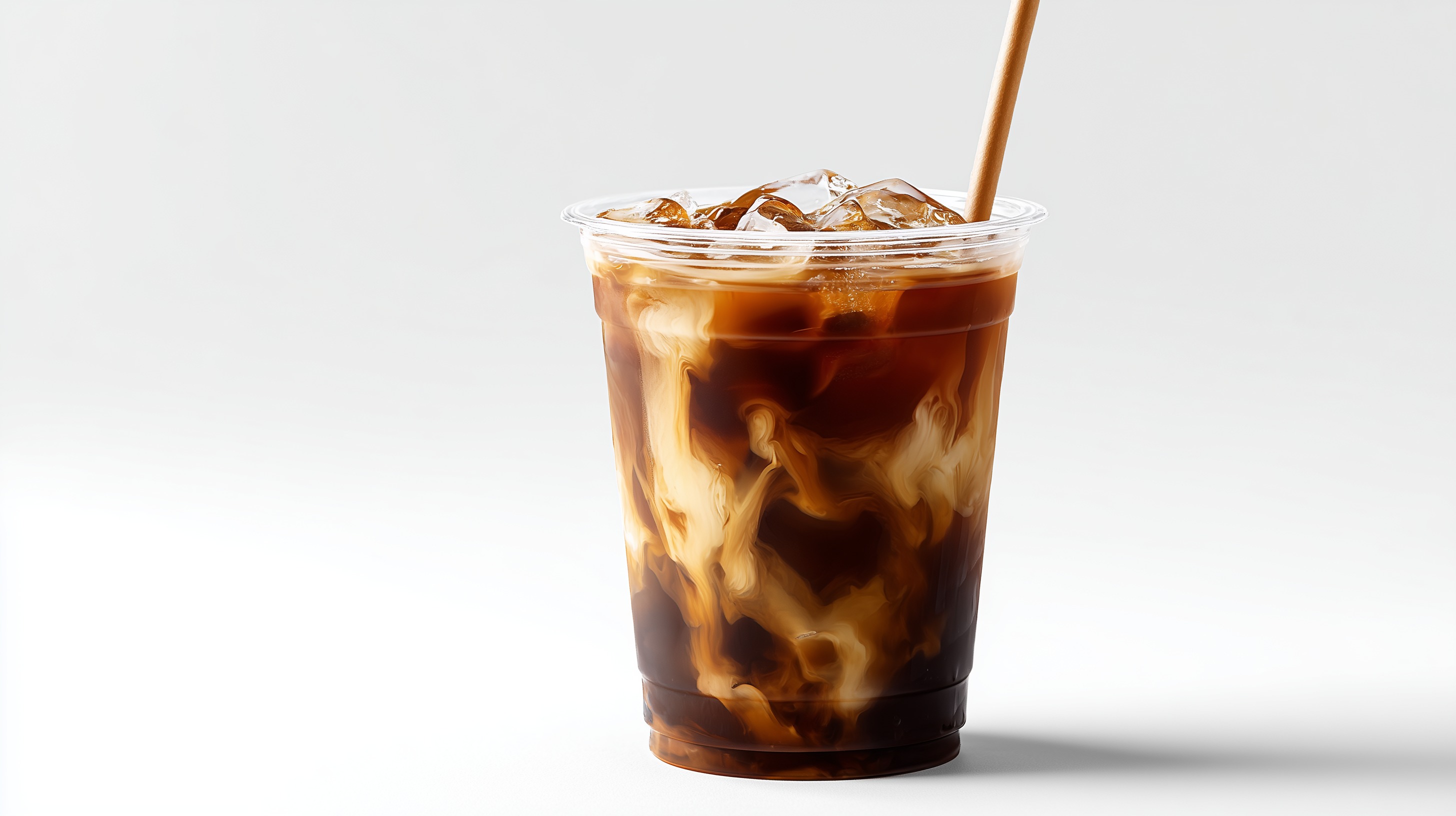Auf diesem Foto ist ein erfrischender Eiskaffee in einem durchsichtigen Glas zu sehen. Das Getränk hat eine dunkelbraune Farbe und ist mit Eiswürfeln und einem Strohhalm garniert. Der Hintergrund ist weiß, was den Fokus ganz auf den Kaffee lenkt. Dieser Eiskaffee wäre perfekt für heiße Sommertage, um sich abzukühlen und gleichzeitig einen Koffeinschub zu bekommen. Das Foto könnte für einen Blog-Beitrag, Social-Media-Post oder eine Werbeanzeige für Kaffeespezialitäten verwendet werden.