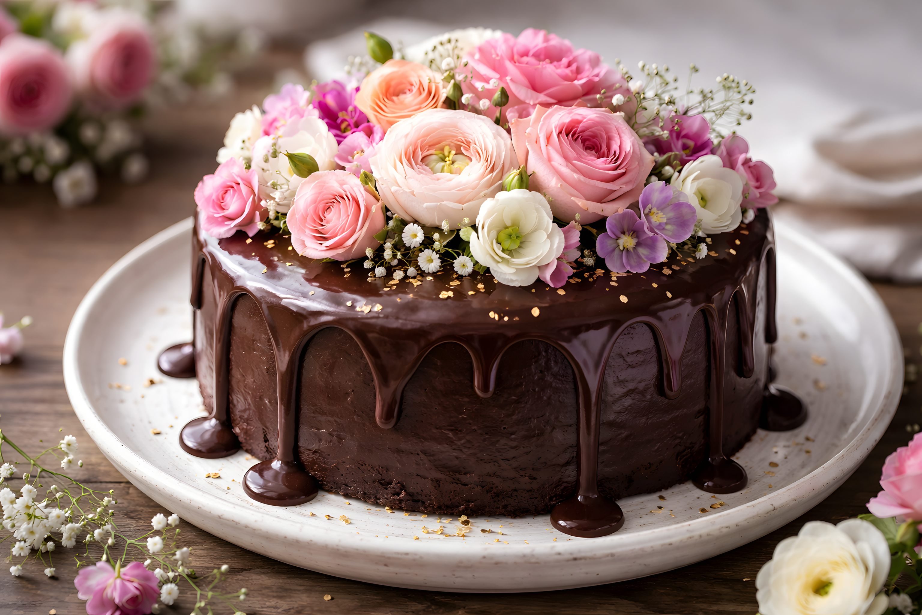 Die prachtvolle, üppig dekorierte Geburtstagstorte auf dem Foto ist ein wahrer Augenschmaus. Die dunkelbraune, glänzende Schokoladen-Ganache umhüllt den Kuchen und verleiht ihm eine elegant-vornehme Optik. Darauf thronen liebevoll arrangierte Blüten in Rosa- und Pastelltönen, darunter zarte Röschen, Anemonen und Wildblumen. Die Dekoration schafft einen natürlichen, romantischen Eindruck und lässt die Torte wie ein kreatives Kunstwerk erscheinen. Die Komposition aus Texturen, Formen und Farben ist ausgewogen und verleiht dem Gebäck einen besonderen, feierlichen Charakter. Diese Torte wäre perfekt für besondere Anlässe wie Hochzeiten, Geburtstage oder Jubiläen geeignet. Sie kann als Blickfang auf Empfängen, Familienfeiern oder in Cafés dienen und Appetit auf die leckere Süßspeise wecken. Durch die dekorative Gestaltung und hochwertige Zutaten strahlt die Torte Eleganz, Genuss und Freude aus.