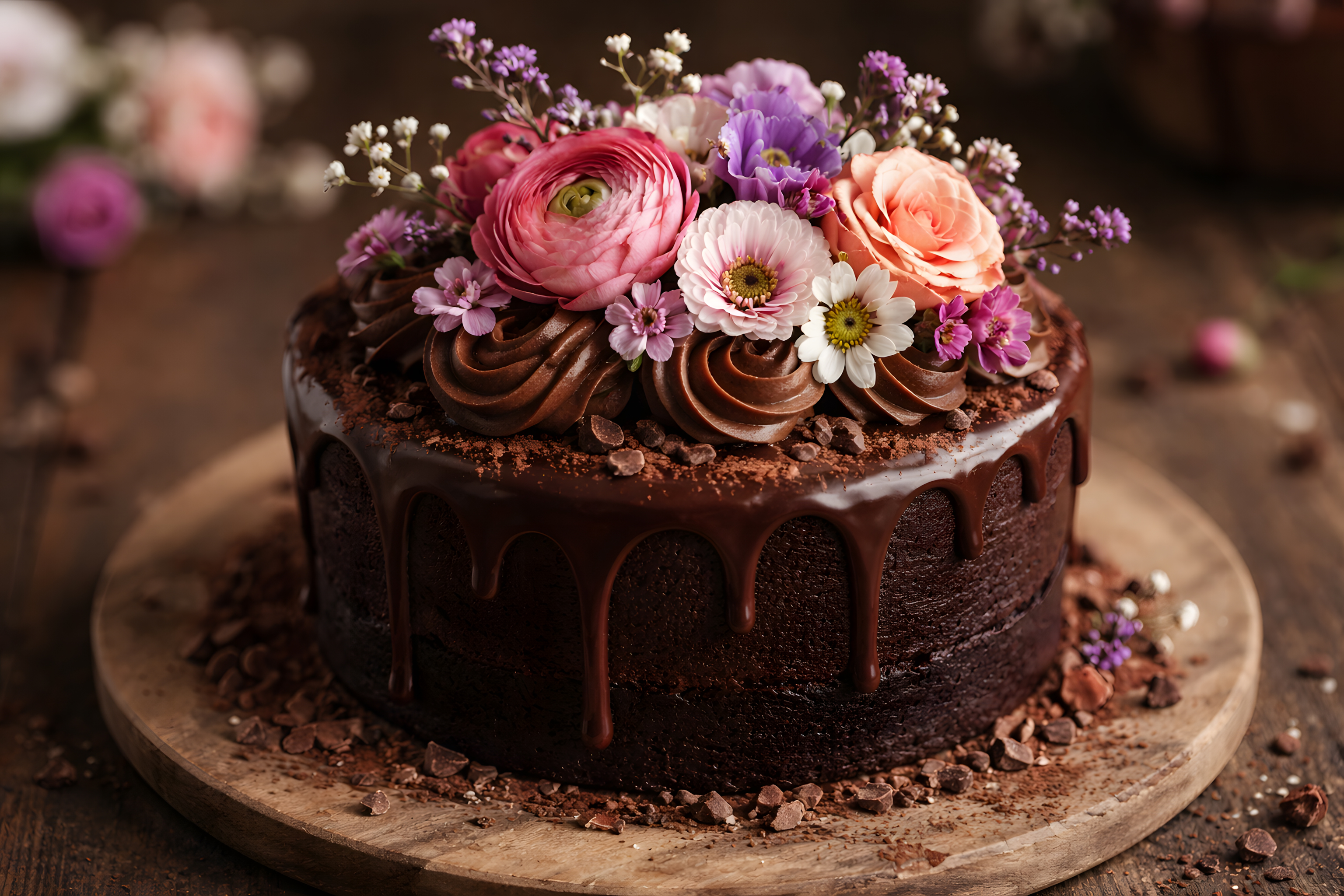 Dieser opulente Schokoladen-Kuchen ist ein wahrer Blickfang. Die üppige Buttercreme-Haube wurde mit einer Fülle prächtiger Blüten dekoriert - von rosa Ranunkeln über zarte Dahlienscheiben bis hin zu kleinen lila Duftveilchen. Der dunkle Überzug aus glänzender Schokolade lässt das Arrangement noch luxuriöser erscheinen. Perfekt für Hochzeiten, Geburtstage oder andere festliche Anlässe, wo der Kuchen als Mittelpunkt und Eyecatcher dienen kann. Das Foto eignet sich hervorragend für Blogs, Social-Media-Beiträge und Werbe-Materialien rund um Süßspeisen und Feierlichkeiten.