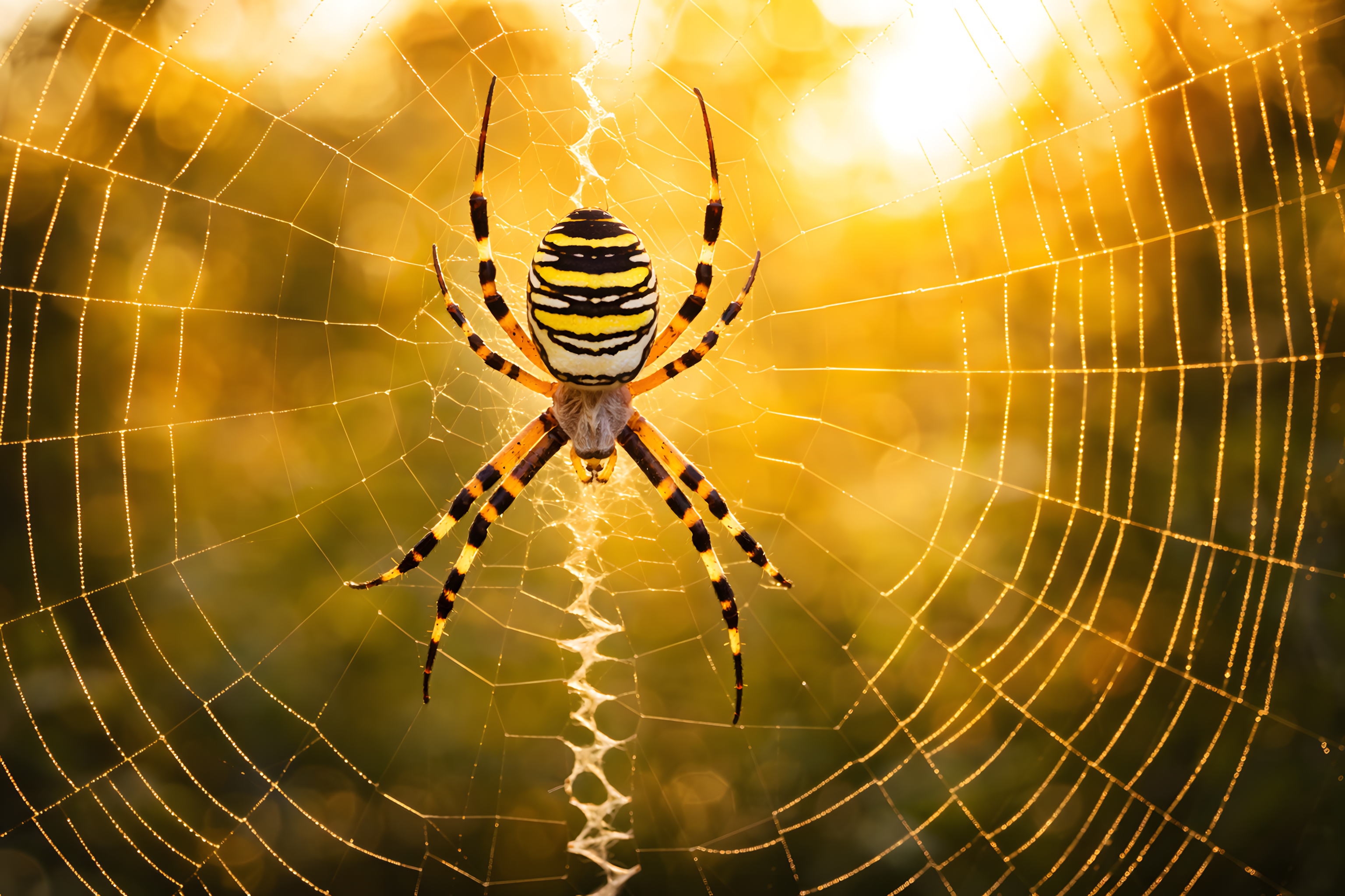 Dieses faszinierende Foto zeigt eine detaillierte Nahaufnahme einer Spinne, die inmitten ihres kunstvollen, goldfarbenen Netzes sitzt. Die Spinne ist prächtig gestreift in Schwarz und Gelb, was ihr ein markantes, fast bedrohliches Aussehen verleiht. Die scharfe Fokussierung und der warme, strahlende Hintergrund aus Sonnenlicht lassen das Bild sehr stimmungsvoll und ästhetisch erscheinen. Die Spinne und ihr Netz sind in einer Weise abgebildet, die ihre faszinierende Struktur und Geometrie hervorhebt und den Betrachter in ihren Bann zieht. Dieses Foto wäre perfekt für den Einsatz in Blogbeiträgen, Newsletter-Designs oder Social-Media-Kanälen, um eine natürliche, mystische und beeindruckende Wirkung zu erzielen.