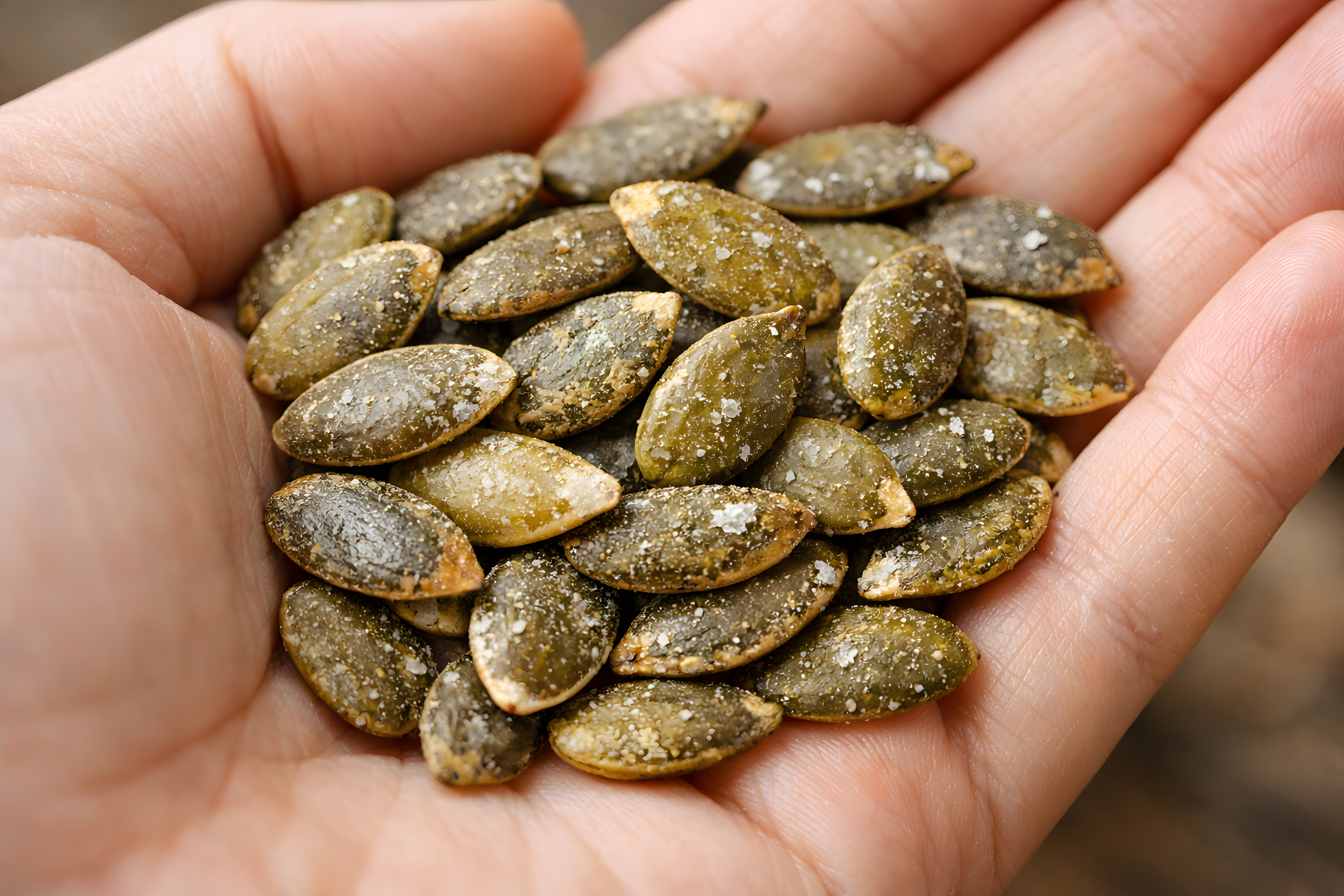Das Foto zeigt eine Handvoll sonnengegerbter Kürbiskerne, die in den Fingerspitzen einer Person ruhen. Die Kerne haben eine auffällige, leicht bräunliche Färbung und eine faszinierende Textur mit kleinen Vertiefungen und Erhebungen an ihrer Oberfläche. Die Komposition des Bildes ist natürlich und reduziert, wodurch der Fokus ganz auf den knackigen Snack gerichtet wird.