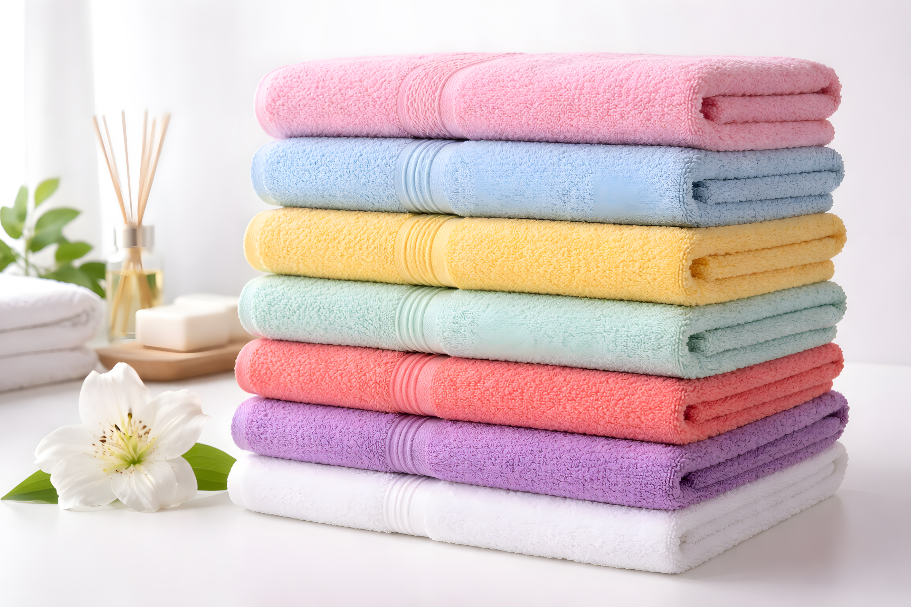 Das Bild zeigt einen Stapel sorgfältig gefalteter Handtücher in verschiedenen pastelligen Farbtönen wie Rosa, Blau, Gelb, Mint und Lila. Die Handtücher sind auf einer weißen Oberfläche angeordnet, umgeben von grünen Blättern und einer weißen Blume, die eine natürliche, frische Atmosphäre schaffen. Die Komposition und die Farbauswahl vermitteln ein Gefühl von Ordnung, Sauberkeit und Ruhe, wie man es in einem gepflegten Badezimmer erwarten würde. Diese Aufnahme könnte ideal für die Präsentation von Handtüchern, Badaccessoires oder Wohndekor in Blogs, sozialen Medien oder Werbekampagnen genutzt werden. Die pastelligen Farben und die minimalistische Ästhetik machen das Bild zu einem stimmungsvollen und inspirierenden Eyecatcher.