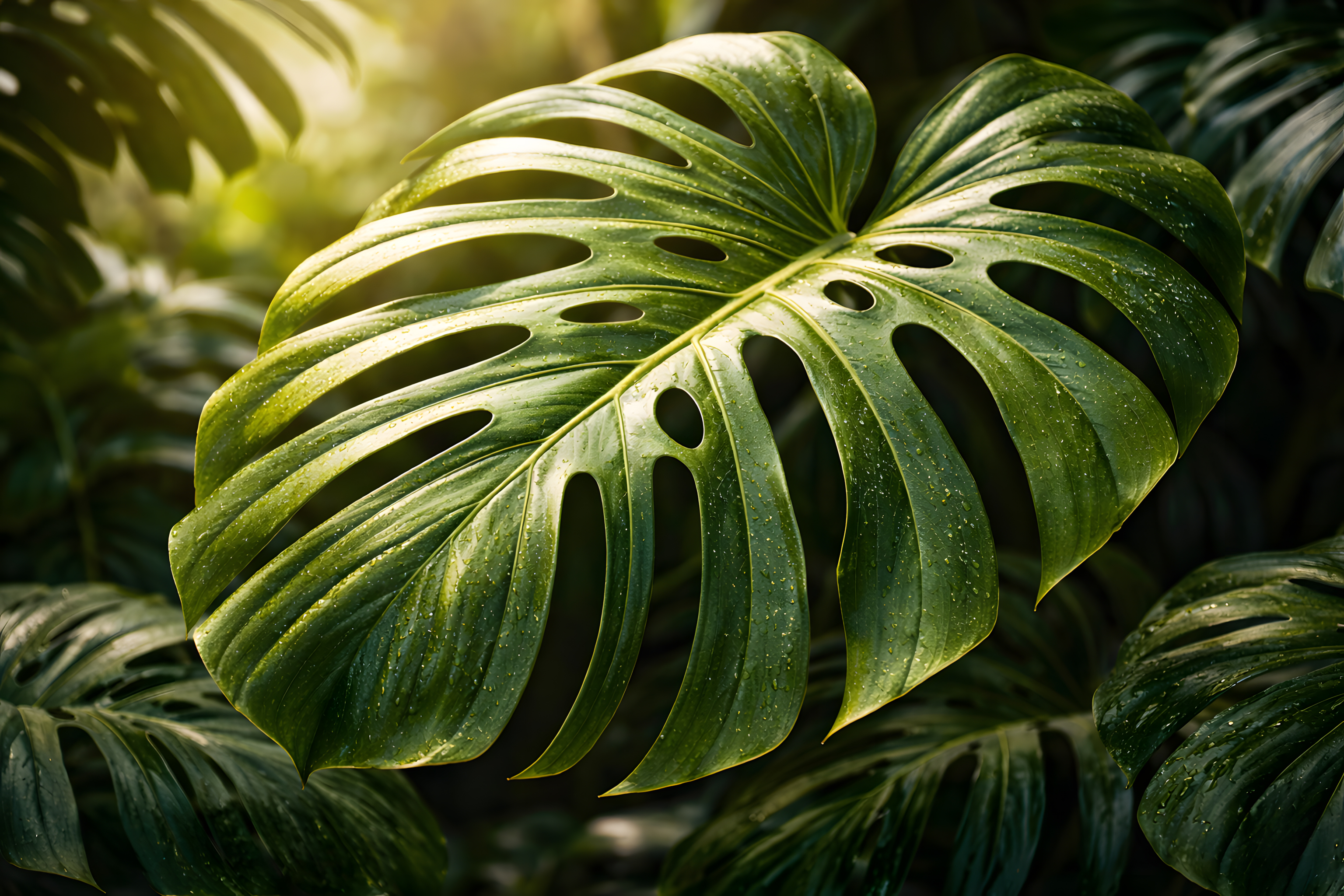 Das Foto zeigt ein üppiges, grünes Blatt einer tropischen Monstera-Pflanze. Die Blattstruktur ist sehr charakteristisch mit seinen tiefen Schlitzen und durchlöcherten Flächen. Das Blatt wirkt plastisch und strukturiert, die Oberfläche ist leicht glänzend mit feinen Wassertropfen. Die Perspektive ist nah und fokussiert, was die Detailvielfalt und Beschaffenheit des Blatts hervorhebt. Solche Blätter bieten sich perfekt an für Naturdarstellungen, Hintergründe oder Illustrationen in Blogs, Social Media-Beiträgen, Präsentationen oder Newslettern rund um Natur, Botanik, Garten oder Dschungel-Themen.