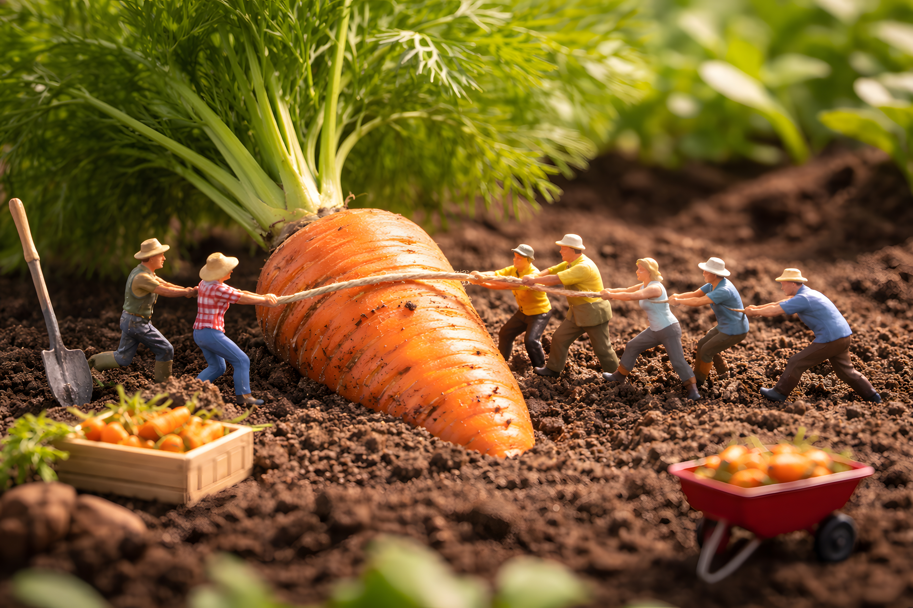 Dieses fantasievolle Foto zeigt, wie eine Gruppe winziger Figuren gemeinsam an einer riesigen Möhre arbeitet. Die detaillierten Puppen in verschiedenen Posen und Tätigkeiten vermitteln einen humorvollen, spielerischen Eindruck der Möhrenernte. Die kräftigen Orangetöne der Möhre kontrastieren schön mit dem dunklen Erdreich und dem grünen Pflanzenwuchs, was die Szene lebendig und dynamisch erscheinen lässt.