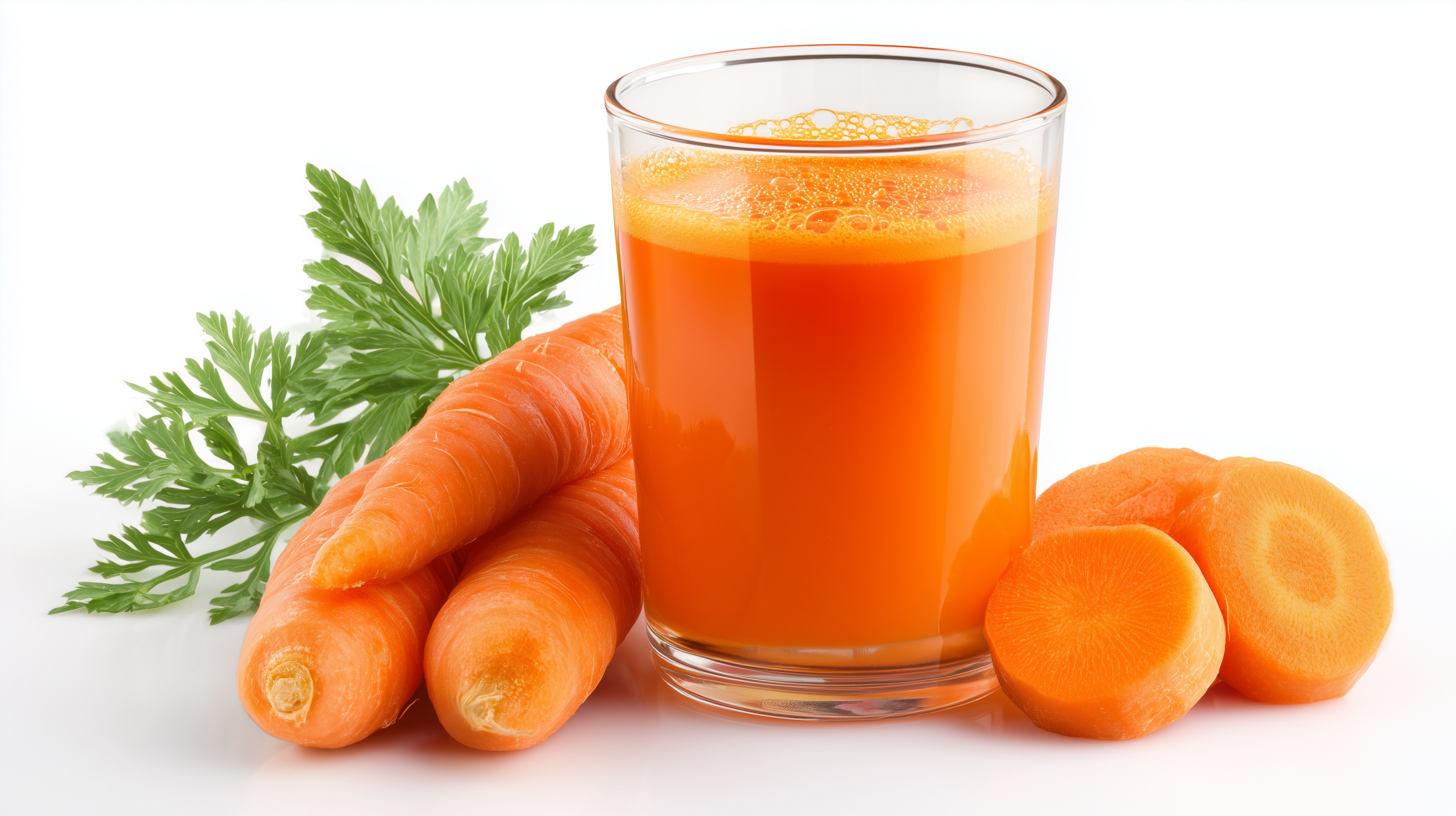 Das Foto zeigt einen Glas voller frisch gepressten, leuchtend orangen Karottensafts. Neben dem Glas sind einige Karotten und grüne Blätter zu sehen, was den natürlichen und gesunden Eindruck des Safts unterstreicht. Der Saft hat eine klare, leuchtend-orange Farbe und ist von Schaum bedeckt, was für ein frisch zubereitetes Getränk typisch ist. Die Komposition des Bildes ist klar und aufgeräumt, mit dem Glas als Mittelpunkt und den Zutaten seitlich angeordnet. Dieser Karottensaft eignet sich hervorragend als Bild für Blogs, Social-Media-Kanäle oder Präsentationen zu den Themen Ernährung, Gesundheit und Wellbeing. Seine natürliche, vitaminreiche Zusammensetzung macht ihn zu einem idealen Motiv, um Konsumenten für eine ausgewogene Lebensweise zu begeistern.