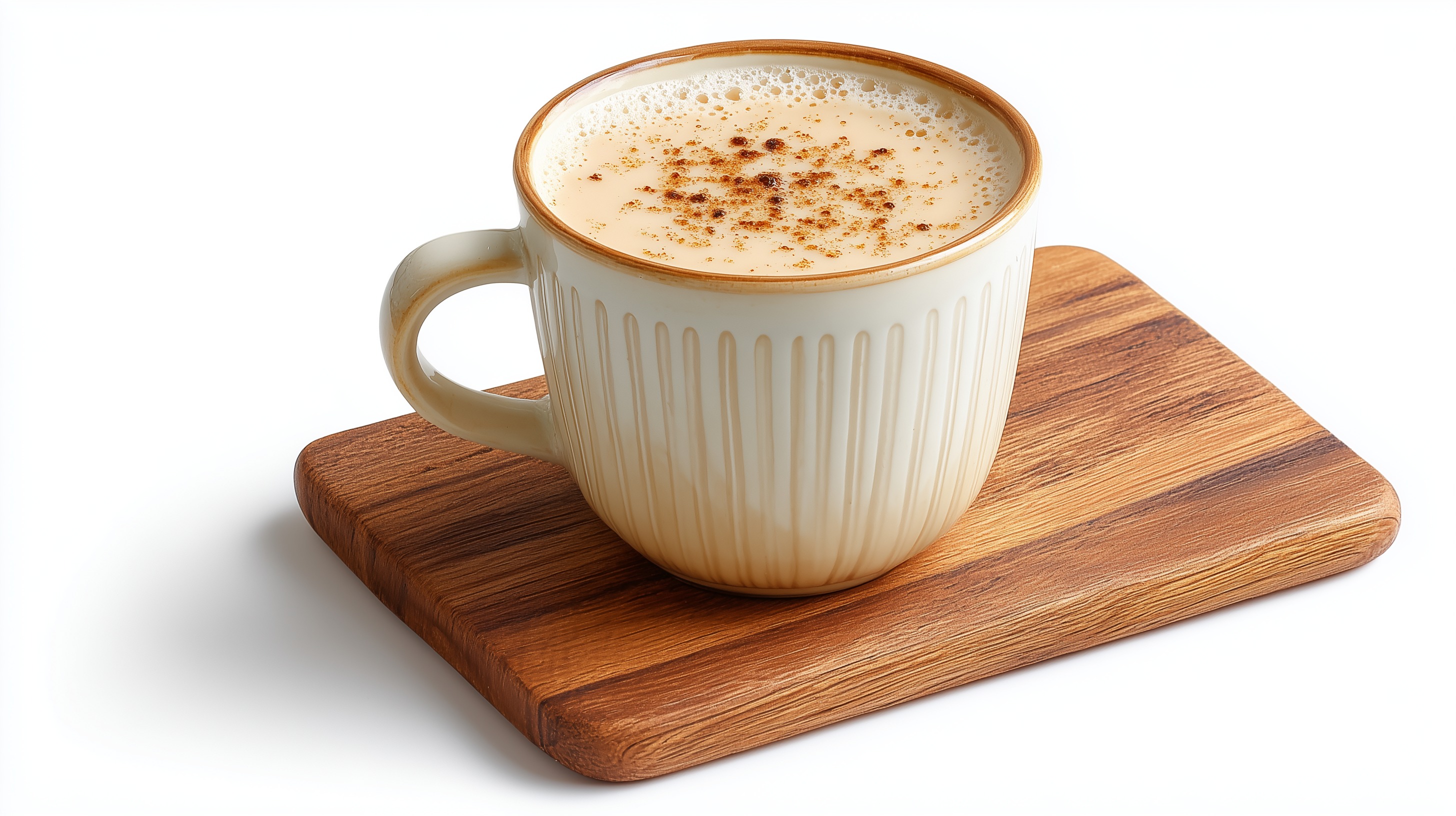 Das Foto zeigt eine dampfende Kaffeetasse auf einem hellen Holzbrett. Die Tasse hat eine gerillte Oberfläche und einen cremigen Schaum, der auf einen hochqualitativen Kaffee hindeutet. Das Holzbrett bringt eine rustikale, gemütliche Note in die Szene. Die Perspektive ist leicht von oben, was dem Bild eine einladende Atmosphäre verleiht. Insgesamt vermittelt das Foto ein stimmungsvolles Frühstücks- oder Pausenerlebnis, das sich hervorragend für den Einsatz in Blogs, auf Social-Media-Kanälen oder in Präsentationen eignet. Es kann Gefühle von Ruhe, Entspannung und Genuss transportieren und ist daher vielseitig einsetzbar.
