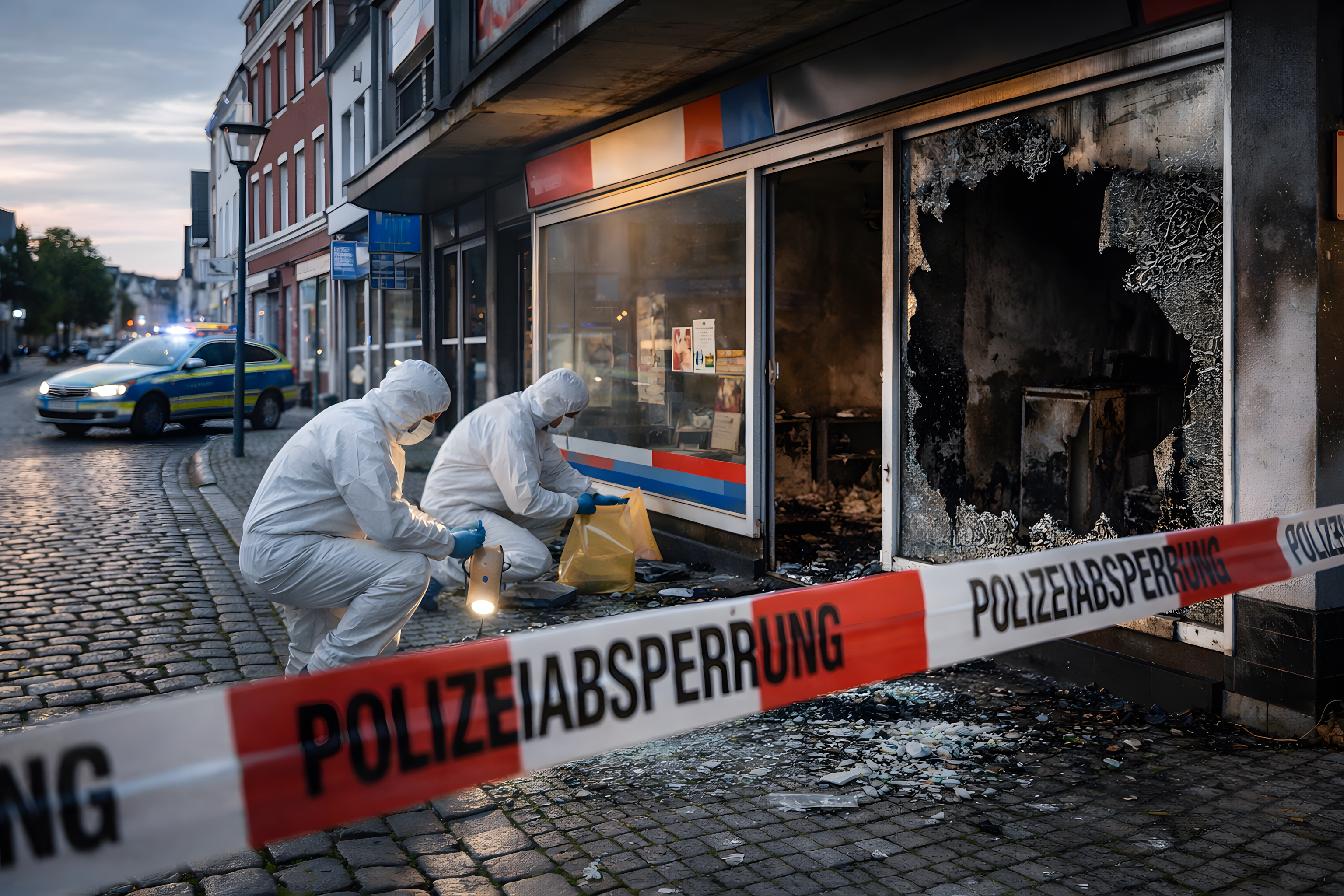 Das Foto zeigt eine Szene eines Brandschadens in einer Innenstadt-Straße bei Dunkelheit. Im Vordergrund sind zwei Personen in weißen Schutzanzügen zu sehen, die offenbar Spuren und Beweise am Tatort sichern. Im Hintergrund ist ein Polizeiauto mit Blaulicht zu erkennen, das die Absperrung des Gebiets überwacht.