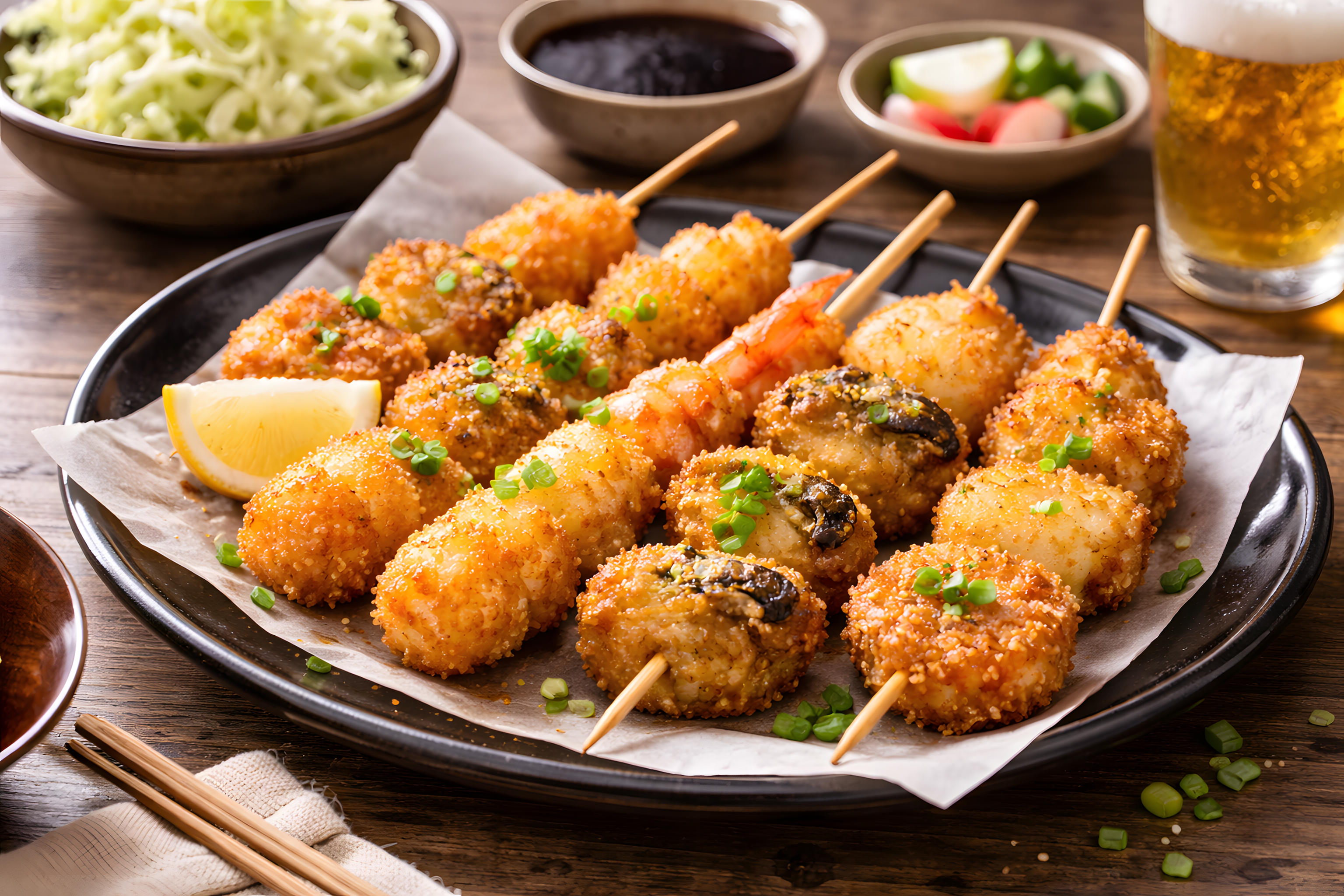 Auf diesem appetitlichen Foto sehen wir eine Auswahl von goldgelb frittierten Tapas-Gerichten, die auf einem dunklen Teller angerichtet sind. Die knusprig ummantelten Häppchen stehen auf Holzspießen und sind mit gehackter Petersilie garniert. Neben den Tapas sind Schälchen mit Salat und einer dunklen Soße zu erkennen, die perfekt als Dip oder Beilage dienen. Ein Glas Bier und ein Zitronenschnitz runden das mediterrane Genusserlebnis ab.