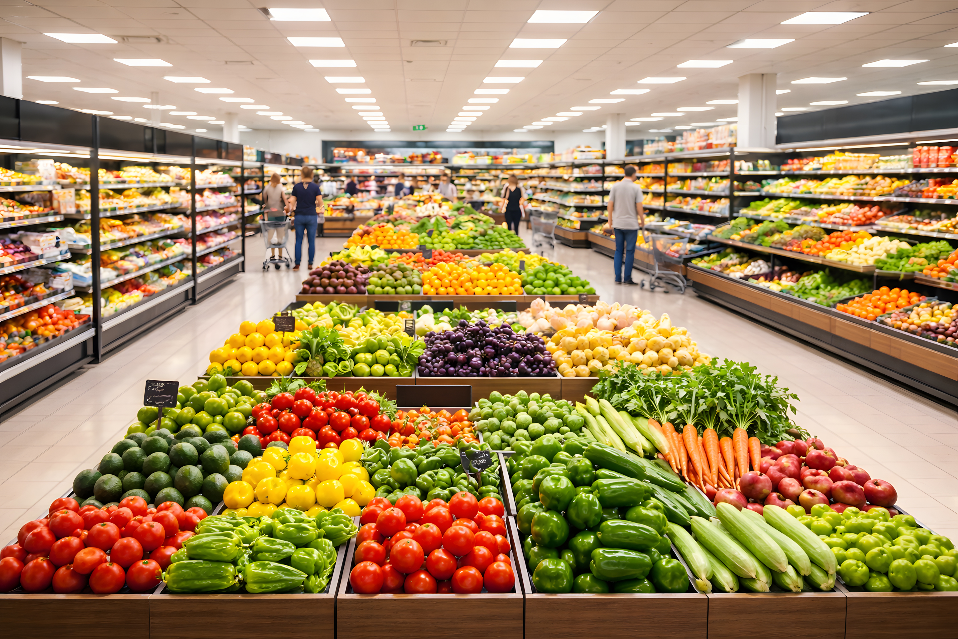 Dieses Foto zeigt einen Blick in die üppig bestückten Obst- und Gemüseregale eines modernen Supermarktes. Es präsentiert eine beeindruckende Vielfalt an frischen, farbenfrohen Lebensmitteln, die sich in geradezu kunstvoll arrangierten Stapeln und Displays anbieten. Von roten Tomaten über grüne Paprikaschoten bis hin zu gelben Zitronen und violetten Weintrauben erstreckt sich hier ein wahres Füllhorn an Vitaminen und Nährstoffen.