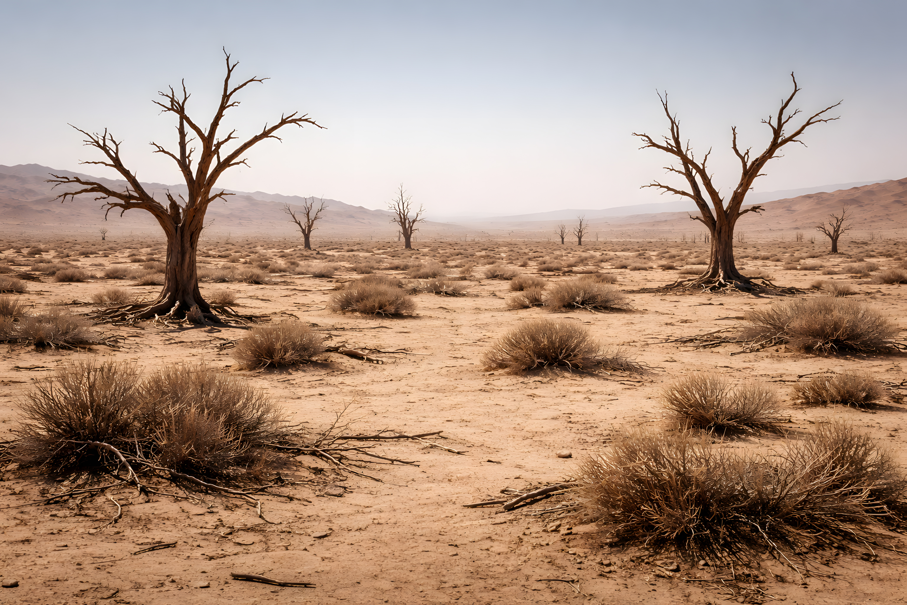 Das Foto zeigt eine verlassene Wüstenlandschaft mit vertrockneten Baumstämmen und Ästen. Die Szenerie wirkt trostlos und leblos, geprägt von der Dürre und Zerstörung. In der Ferne sind weitere abgestorbene Bäume zu erkennen, die den Eindruck von Einsamkeit und Verlassenheit verstärken. Die Farben sind erdig und monochrom, die Strukturen rau und rissig. Diese Aufnahme vermittelt eine Atmosphäre der Vergänglichkeit und Stille, die perfekt für Blogbeiträge, Social-Media-Postings oder Präsentationen zum Thema Naturkatastrophen, Umweltzerstörung oder die Schönheit des Verfalls geeignet ist.