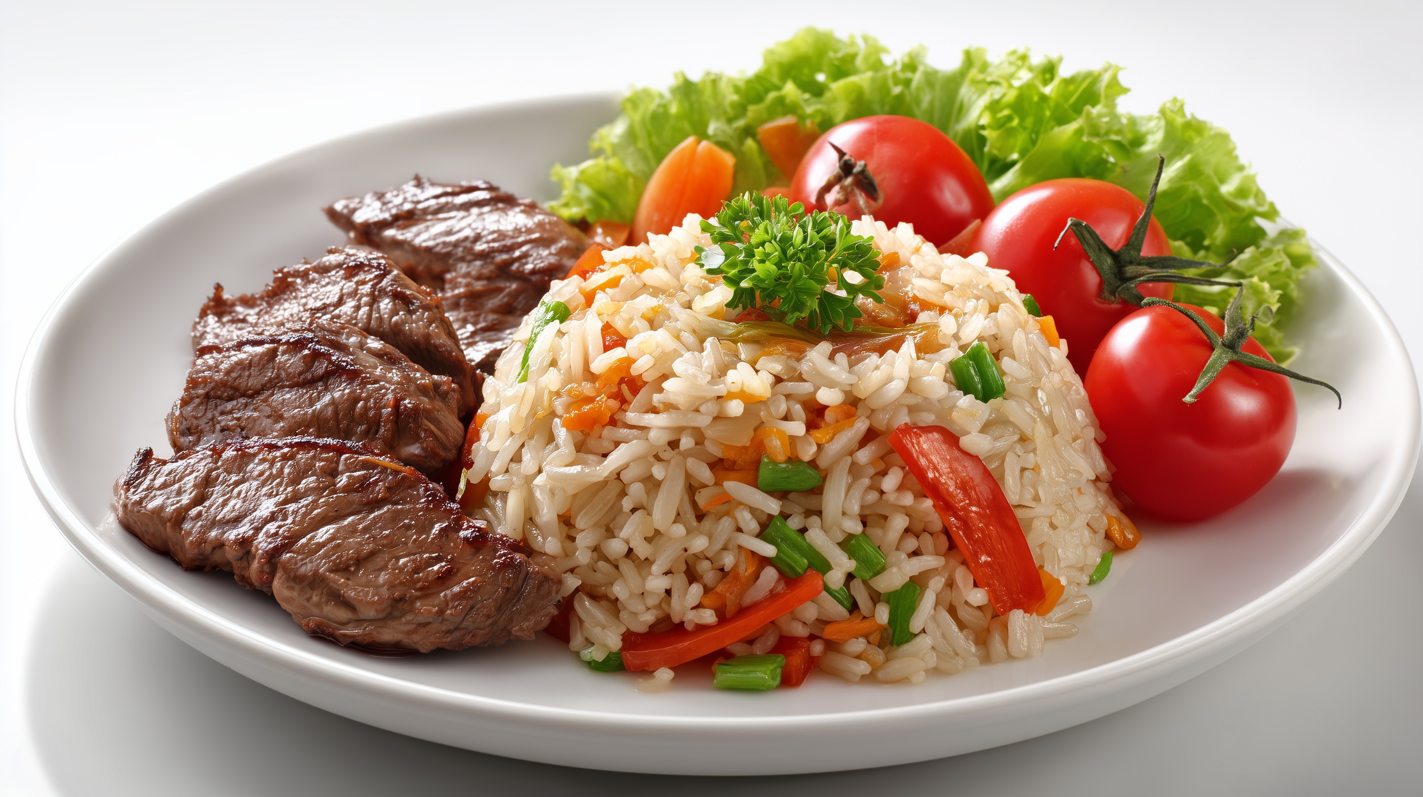Auf diesem Foto ist ein appetitliches Fleischgericht mit Reis und frischem Gemüse zu sehen. Der Teller ist ansprechend angerichtet und zeigt ein harmonisches Farbspiel von Rot, Grün und Braun. Im Zentrum befinden sich saftige, gegarte Rindfleischstreifen, die von einem bunten Reisgericht umgeben sind. Daneben liegen knackige Salatblätter und reife Tomaten, die dem Gericht eine erfrischende Note verleihen.