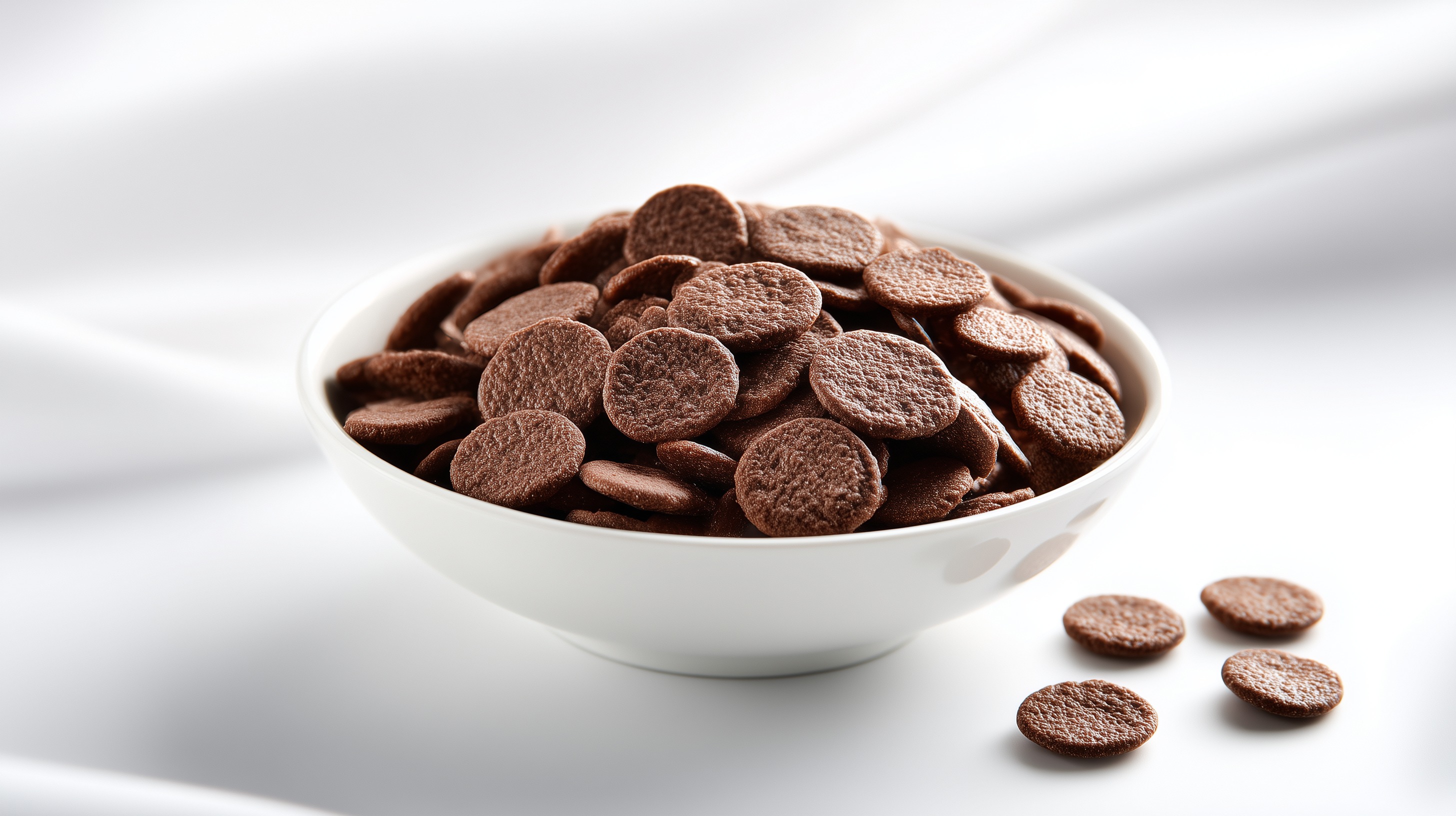 Dieses Foto zeigt eine Schüssel voller köstlicher Schokoladen-Bonbons. Die runden Formen der Bonbons bilden ein appetitliches Arrangement in einer weißen Schüssel, die vor einem hellen Hintergrund platziert ist. Die dunkelbraunen Schokoladenstücke mit ihrer glänzenden Oberfläche stehen im Kontrast zum schlichten Weiß der Schüssel und des Hintergrunds, was das Bild optisch ansprechend und harmonisch erscheinen lässt.