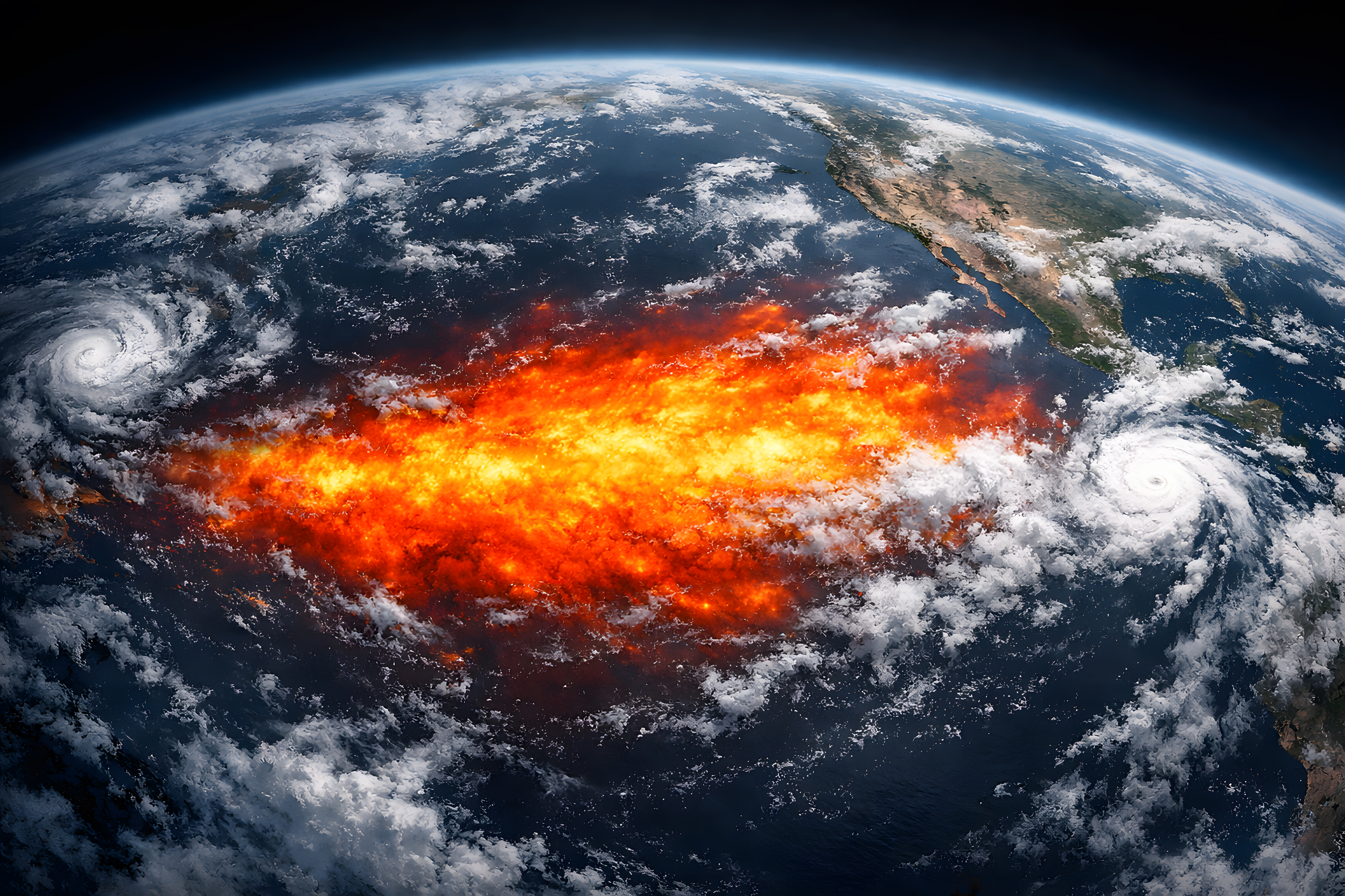 Die feurig-orange Farbtöne kontrastieren stark mit dem dunklen Hintergrund des Weltraums und der blauen Erdatmosphäre, was eine bedrohliche, apokalyptische Stimmung erzeugt. Die Perspektive aus dem All verdeutlicht die globale Dimension der Klimakatastrophe. Dieses Bild eignet sich hervorragend, um die Dringlichkeit des Handelns gegen den Klimawandel zu vermitteln und zum Nachdenken anzuregen.