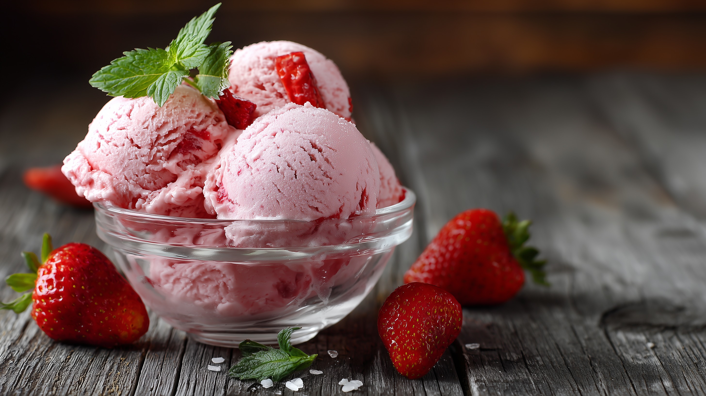 Das Foto zeigt mehrere frisch zubereitete Kugeln Erdbeereis in einem Glas auf einer dunklen Holzoberfläche. Die Eiskugeln haben eine schöne rosa Farbe und sind mit frischen Erdbeeren und Minzblättern dekoriert, die einen erfrischenden Akzent setzen. Das Bild strahlt eine sommerliche und verführerische Atmosphäre aus, die Lust auf einen kühlen Genuss macht. Diese Aufnahme eignet sich hervorragend für Sommerblogbeiträge, Social-Media-Posts oder Präsentationen rund um Desserts, Eis und Lebensmittelfotos. Die hochwertige Bildqualität und der appetitliche Kontrast zwischen dem Eis, den Früchten und dem rustikalen Holzhintergrund machen dieses Foto zu einem echten Hingucker.