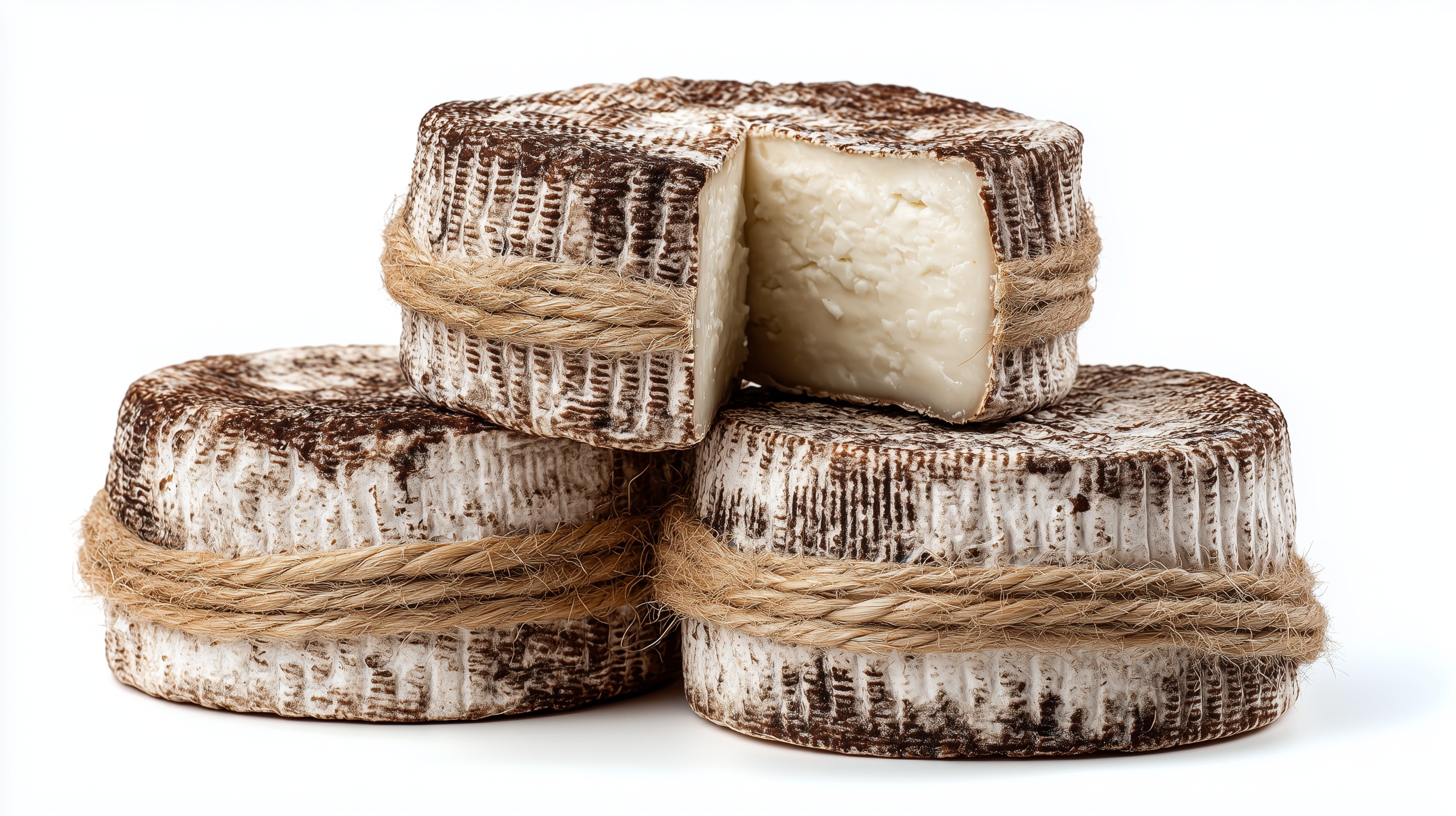 Dieses Foto zeigt mehrere rustikale Käselaibe in verschiedenen Reifungsstadien. Die runden Laibe haben eine braune, leicht genarbte Rinde, die durch den Reifeprozess entsteht. Das Innere des Käses ist cremig-weiß. Die Käselaibe sind mit Bindfäden umwickelt, was den traditionellen, handwerklichen Herstellungsprozess unterstreicht. Solche Käsespecialitäten finden Verwendung in der gehobenen Gastronomie, in Delikatessenläden oder als hochwertiges Mitbringsel. Das Foto eignet sich gut für Beiträge zu Themen wie Lebensmittelhandwerk, Kulinarik oder regionale Spezialitäten in Blogs, Social Media-Posts oder Präsentationen.