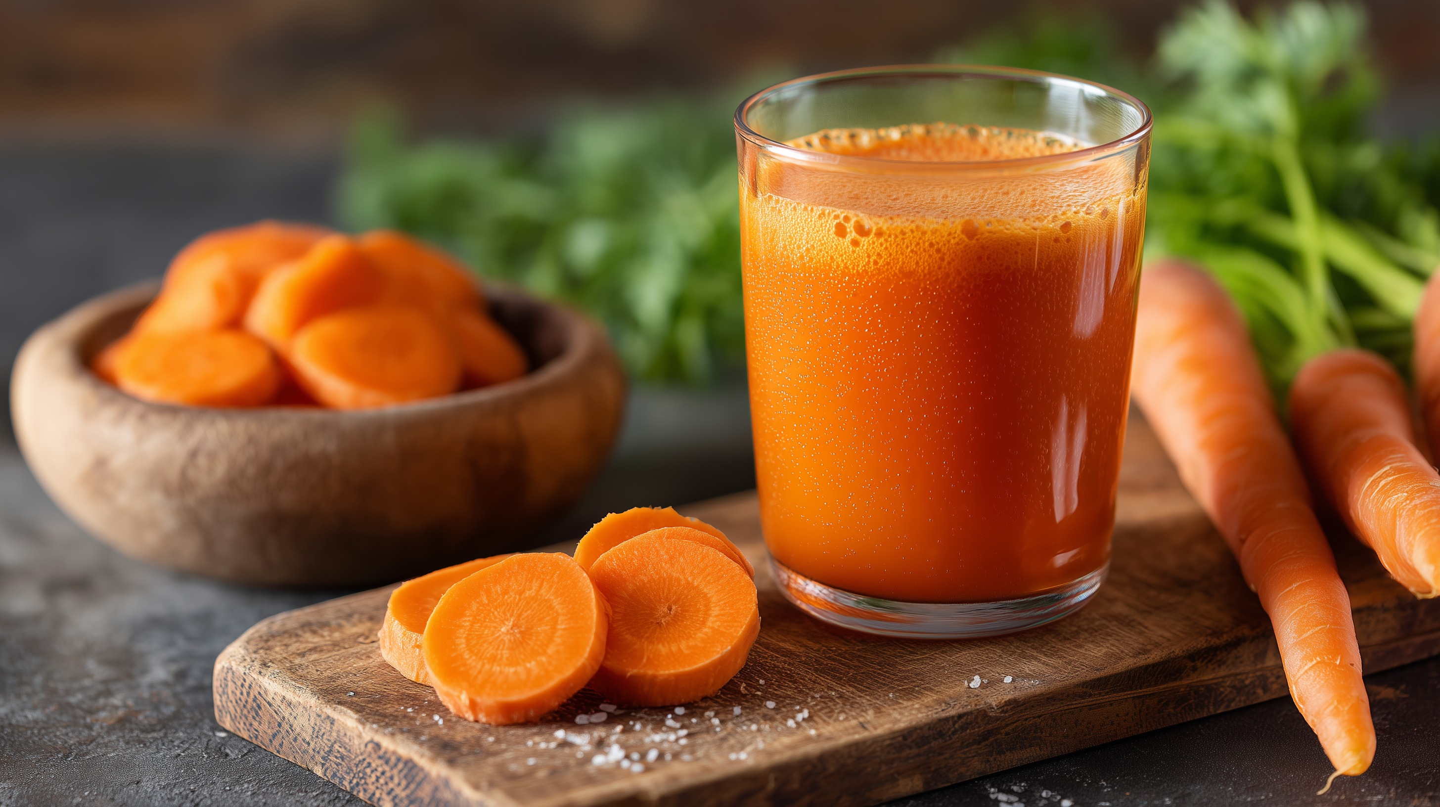 Auf diesem Foto sehen wir einen frisch gepressten Karottensaft in einem hohen Glas. Die lebendig orangefarbene Flüssigkeit ist umgeben von frischen Möhren und grünen Kräutern, die das gesunde Getränk abrunden. Der Saft wurde auf einem rustikalen Holztisch mit natürlicher Beleuchtung fotografiert, was der Szene eine ansprechende, appetitliche Optik verleiht.
