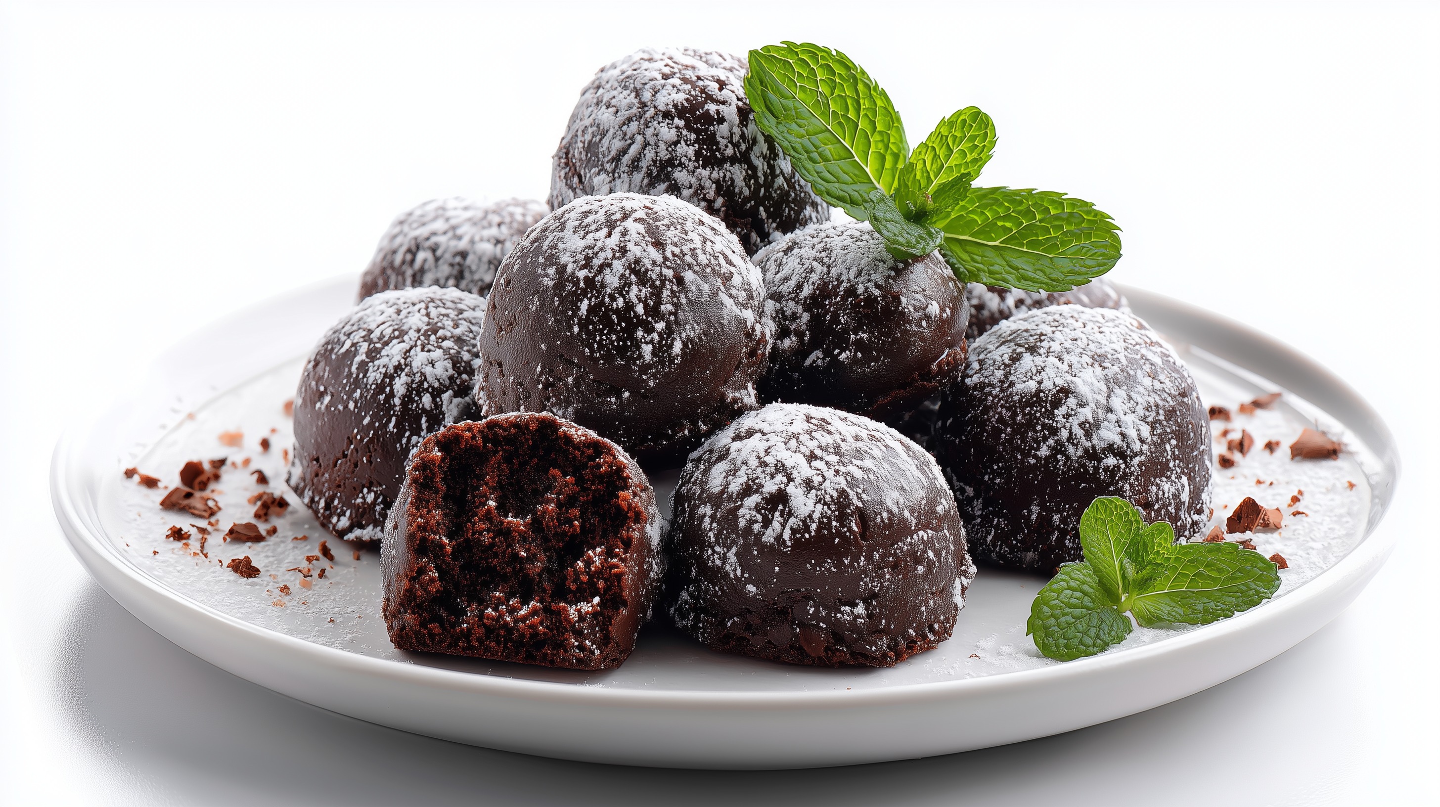 Das Foto zeigt eine Auswahl saftig-weicher Schokoladendesserts, die auf einem weißen Teller angerichtet sind. Die runden Kugeln sind mit einer dunklen, glänzenden Schokoglasur überzogen und mit feinem Puderzucker bestäubt. Einige der Kugeln sind angeschnitten, sodass man den saftigen, schokoladigen Innenkern sehen kann. Als dekorative Elemente dienen frische Minzblätter, die dem Arrangement einen frischen, natürlichen Akzent verleihen. Die Perspektive der Aufnahme ist leicht von oben, was dem Bild eine appetitliche, einladende Wirkung verleiht. Dank des einfarbigen Hintergrunds stehen die Schokoladenkugeln im Mittelpunkt und kommen besonders gut zur Geltung.