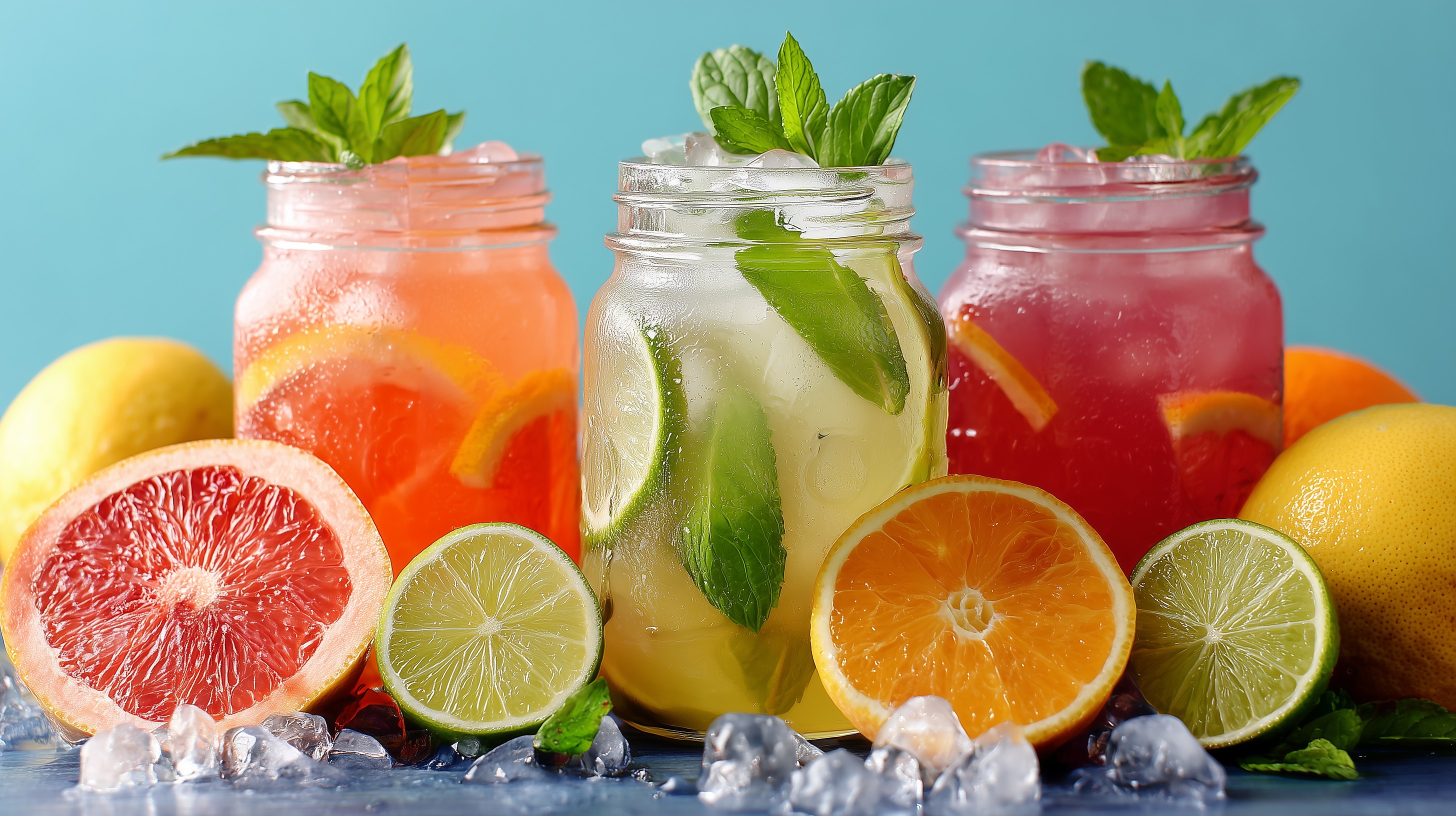 Dieses Foto präsentiert eine Auswahl an erfrischenden Getränken, die perfekt für den Sommergenuss geeignet sind. Im Mittelpunkt stehen verschiedene Glasbehälter mit eiskalten Limonaden und Cocktails, die mit Zitronen, Orangen, Limetten und frischer Minze dekoriert sind. Die leuchtenden Farben und die klare, fokussierte Aufnahme erzeugen eine einladende und appetitliche Atmosphäre. Diese Getränkekreationen eignen sich hervorragend als Hingucker für Foodblogs, Social-Media-Posts oder Werbeanzeigen für Restaurants, Cafés und Catering-Anbieter. Mit ihren natürlichen Zutaten und der erfrischenden Optik stellen sie eine gesunde Alternative zu herkömmlichen Erfrischungsgetränken dar.