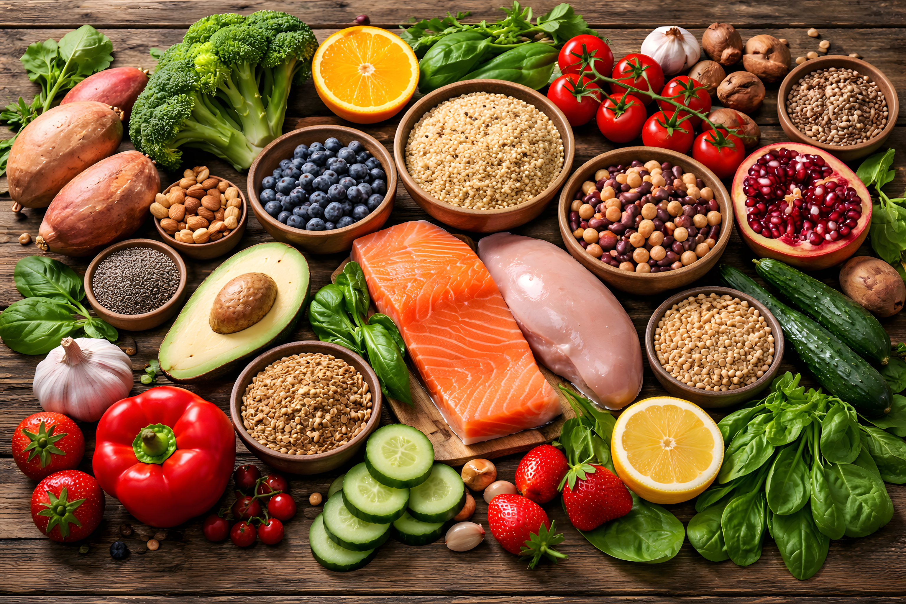Dieses Foto präsentiert eine üppige Auswahl an gesunden, natürlichen Lebensmitteln auf einem rustikalen Holztisch. Im Mittelpunkt stehen frisches Gemüse wie Brokkoli, Spinat und Tomaten, ergänzt durch vitamin- und ballaststoffreiche Früchte wie Orangen, Blaubeeren und Granatäpfel. Daneben sehen wir proteinreiche Zutaten wie Lachs, Hühnerfilet, Linsen und Kichererbsen. Die Komposition wird durch verschiedene Nüsse, Samen und Gewürze wie Knoblauch, Ingwer und Zimt abgerundet. Die harmonische Farbpalette aus Grün, Orange, Rot und Braun erzeugt einen natürlichen, einladenden Eindruck.