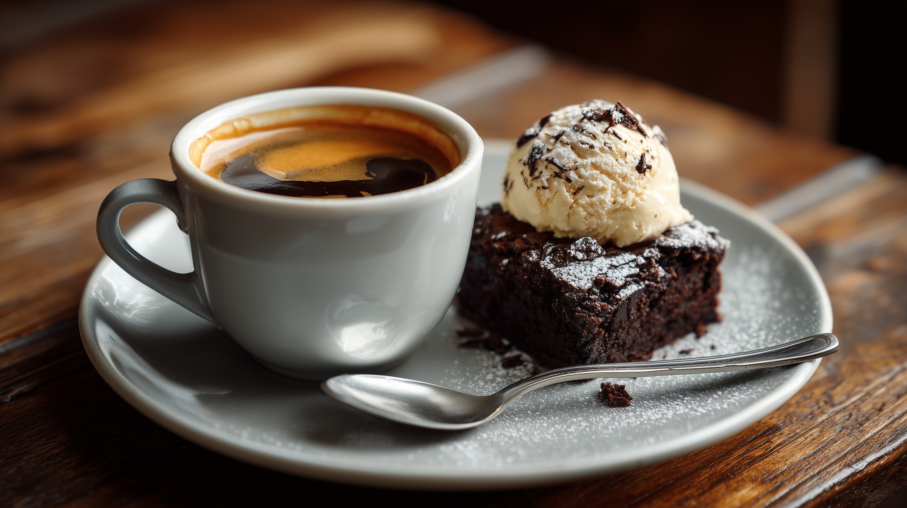 Das Foto zeigt ein köstliches Dessert - einen dunklen Schokoladenkuchen, der mit Puderzucker bestäubt ist und eine Kugel cremiges Eis auf der Seite hat. Der Kuchen liegt auf einem grauen Teller, der auf einem rustikalen Holztisch steht. Daneben befindet sich eine Tasse Kaffee mit einer schönen Crema-Oberfläche. Das Arrangement wirkt stimmungsvoll und gemütlich, die Farben sind dunkel und warm gehalten. Dieses Foto wäre perfekt für die Bewerbung eines Cafés, Restaurants oder einer Konditorei, um Appetit auf leckere Nachspeisen zu machen. Es eignet sich aber auch hervorragend für Präsentationen, Blogbeiträge oder Social-Media-Posts rund um das Thema Genuss und Entspannung.