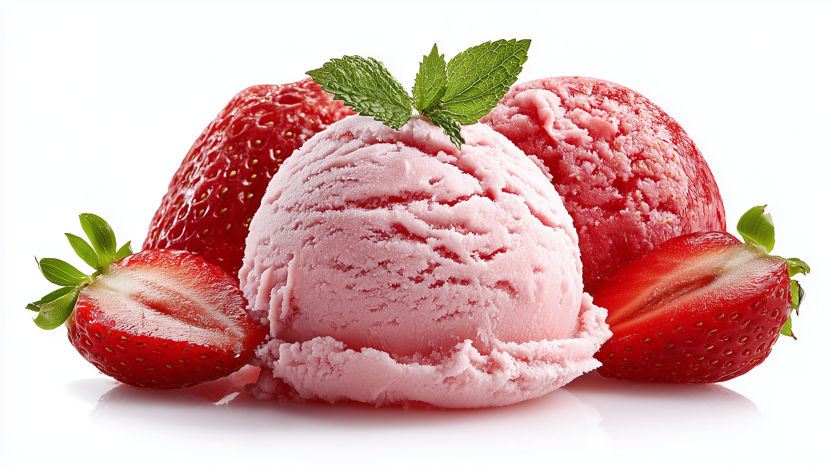 Dieses Foto zeigt eine köstliche Portion Erdbeereis mit Minzblättern. Die leuchtend roten Erdbeeren kontrastieren wunderschön mit dem cremig-pinken Eis und den frischen, grünen Minzblättern. Die Perspektive ist nah und lässt den Betrachter das kühle, erfrischende Dessert fast schmecken. Dieses Foto wäre ideal für den Einsatz in Rezeptbeiträgen, auf Social-Media-Kanälen oder zur Illustration von Artikeln über Sommergerichte, Eismanufakturen oder gesunde Ernährung. Die sorgfältige Komposition und die appetitanregenden Farben machen es zu einem echten Hingucker.