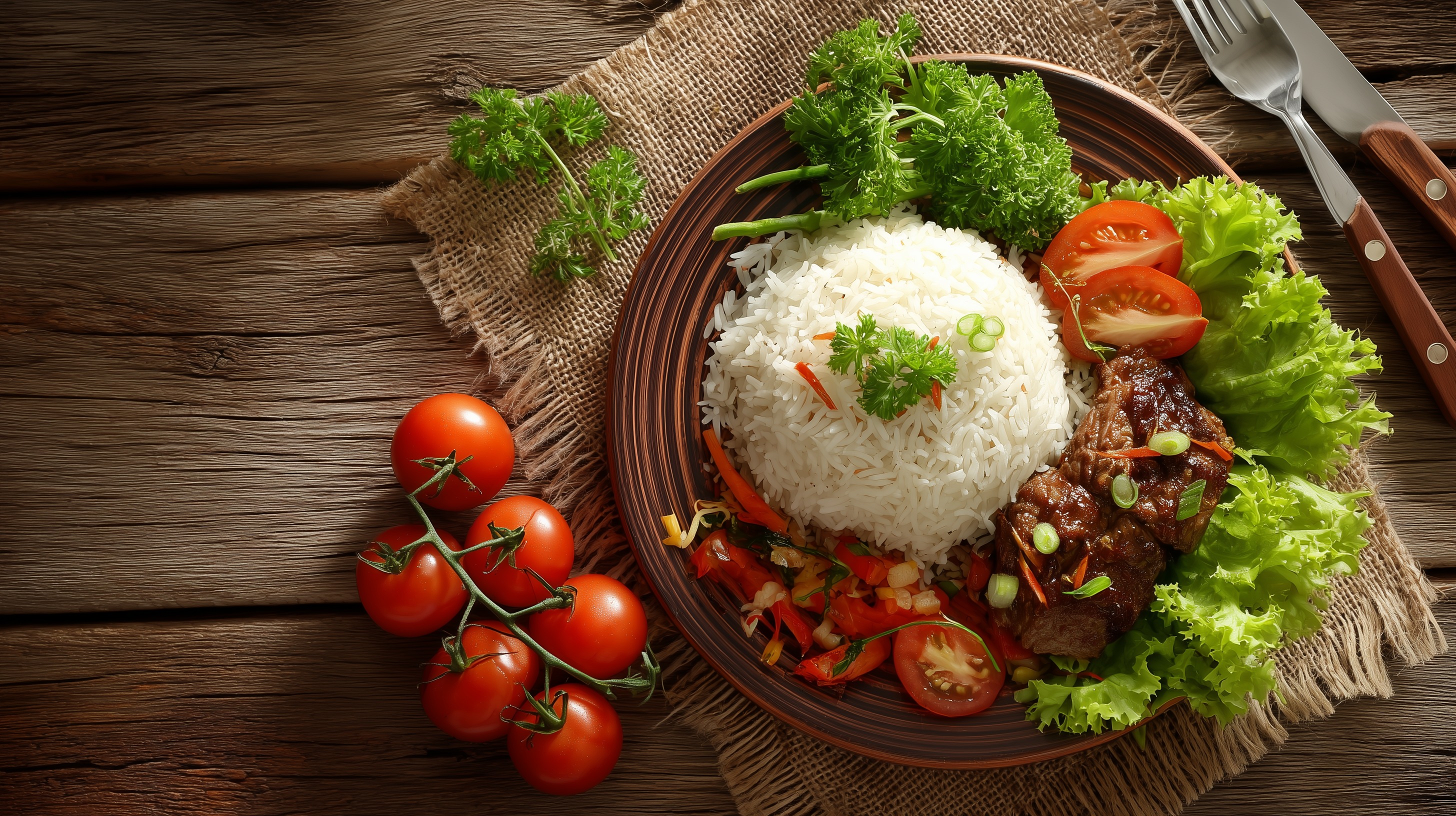 Dieses Foto zeigt ein leckeres und gesundes Mittagsgericht: Auf einem dunklen, rustikalen Holzteller präsentiert sich eine farbenfrohe Komposition aus verschiedenen Zutaten. Der Teller ist mit weißem Reis gefüllt, der mit frisch gehackter Petersilie dekoriert ist. Umgeben wird der Reis von knackigen, grünen Salatblättern und leuchtend roten Tomaten. Darüber wurde ein würziges, vegetarisches Ragu aus Gemüse und Kräutern angerichtet, welches dem Gericht eine appetitliche Note verleiht.