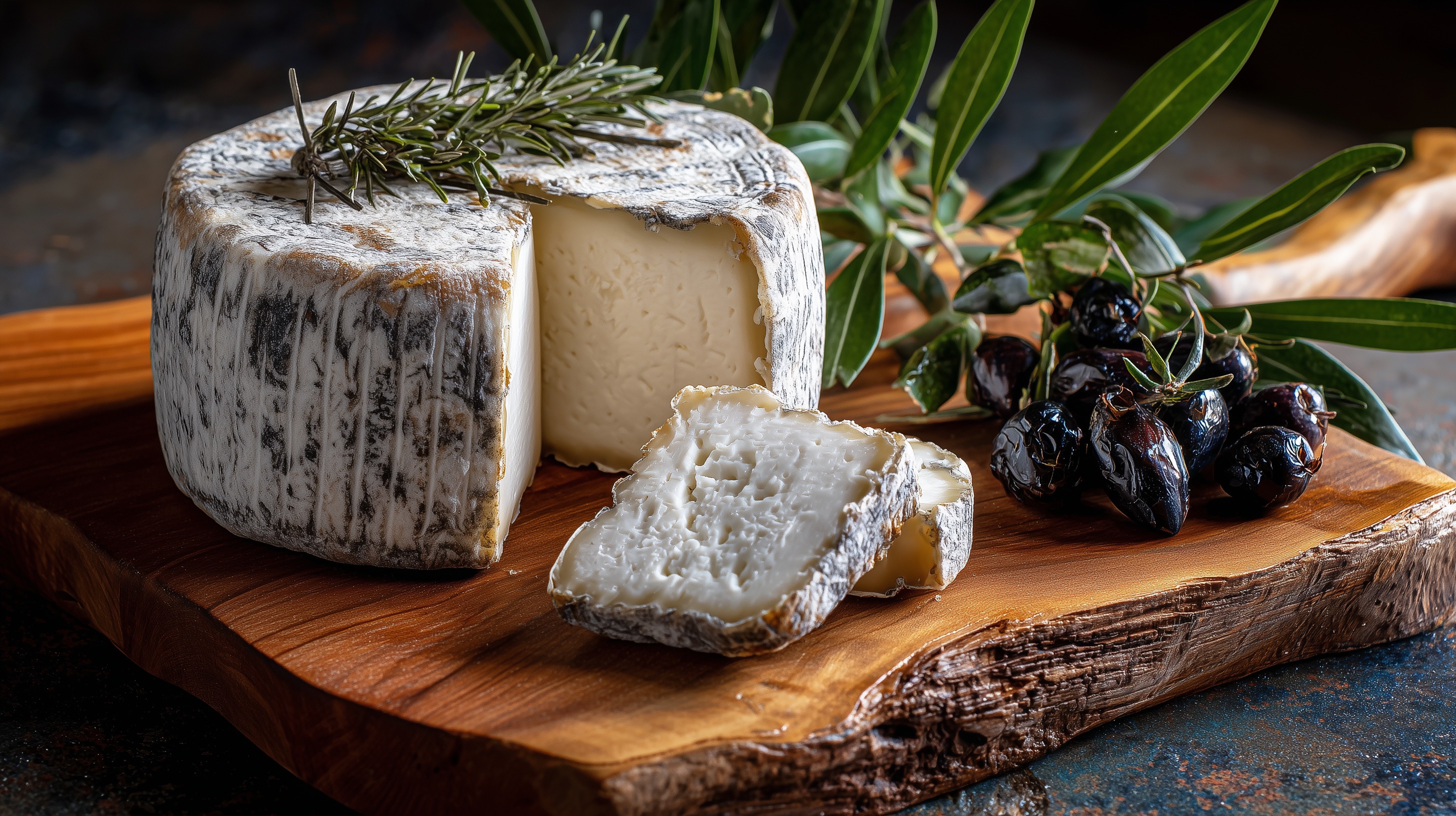 Dieses Foto zeigt einen köstlichen Käse, umgeben von saftigen Oliven und frischen Kräutern. Der Käse hat eine wunderbare, marmorierte Rinde und eine cremige, weiche Konsistenz, die zum genussvollen Verkosten einlädt. Die dunklen Oliven bieten einen aromatischen Kontrast, während die grünen Kräuter eine frische Note verleihen. Das Arrangement auf dem rustikalen Holzbrett schafft eine natürliche, mediterrane Atmosphäre, die appetitanregend und einladend wirkt. Dieses Bild eignet sich hervorragend für Rezeptblogbeiträge, Präsentationen zu Themen rund um Lebensmittelgenuss sowie für kreative Postings in sozialen Medien, um den Betrachter direkt in eine kulinarische Erlebniswelt zu entführen.