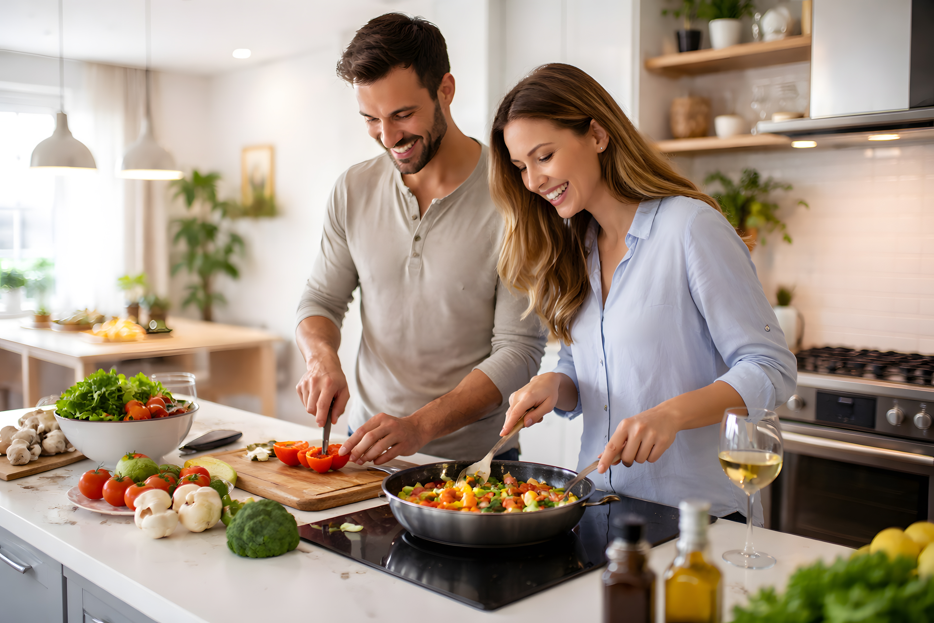 Auf diesem Foto sieht man ein junges, lächelndes Paar, das gemeinsam in einer modernen, hellen Küche kocht. Sie stehen am Küchentresen und schneiden frisches Gemüse wie Paprika, Tomaten und Blattsalat. Die Szene strahlt Gemeinschaft, Leichtigkeit und Freude am gemeinsamen Kochen aus. Die natürliche Beleuchtung und die moderne Einrichtung mit Holzelementen verleihen dem Bild einen warmen, wohnlichen Charakter. Diese Aufnahme könnte für Blogs, Social-Media-Kanäle oder Präsentationen rund um die Themen gesunde Ernährung, Kochen und Lifestyle verwendet werden.