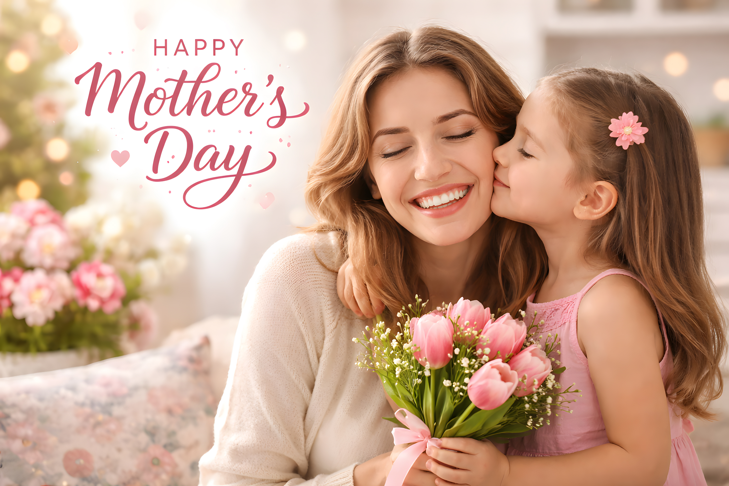Auf diesem Foto sehen wir eine liebevolle Mutter-Tochter-Szene, die den Muttertag feiern. Die Mutter umarmt ihre Tochter zärtlich, während beide glücklich lächeln. Im Vordergrund halten sie einen Strauß rosa Tulpen, ein traditionelles Geschenk zum Muttertag. Der Hintergrund ist romantisch mit einer festlichen Dekoration aus Blumen und Lichterketten geschmückt, was die Feierlichkeit des Moments unterstreicht. Das Bild strahlt eine Atmosphäre von Liebe, Dankbarkeit und Zusammenhalt aus - Werte, die für den Muttertag so charakteristisch sind. Diese Aufnahme wäre perfekt geeignet für eine Grußkarte, einen Blogbeitrag oder eine Präsentation zum Thema Familie, Tradition oder Feiertage.